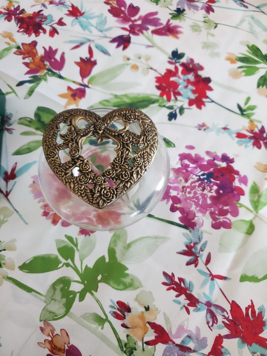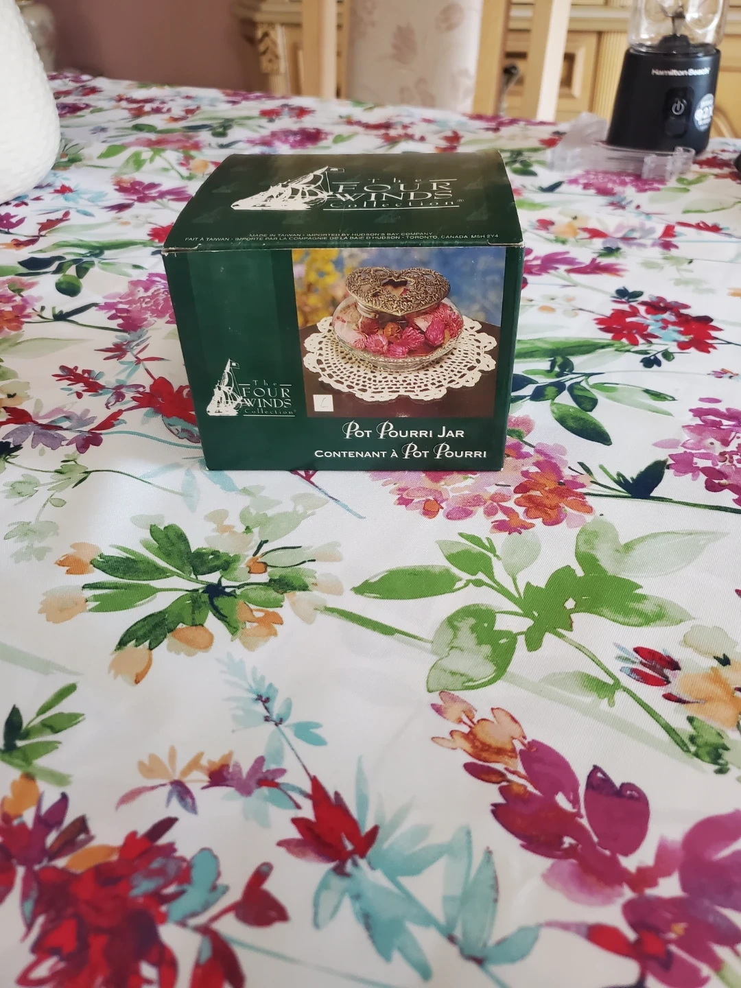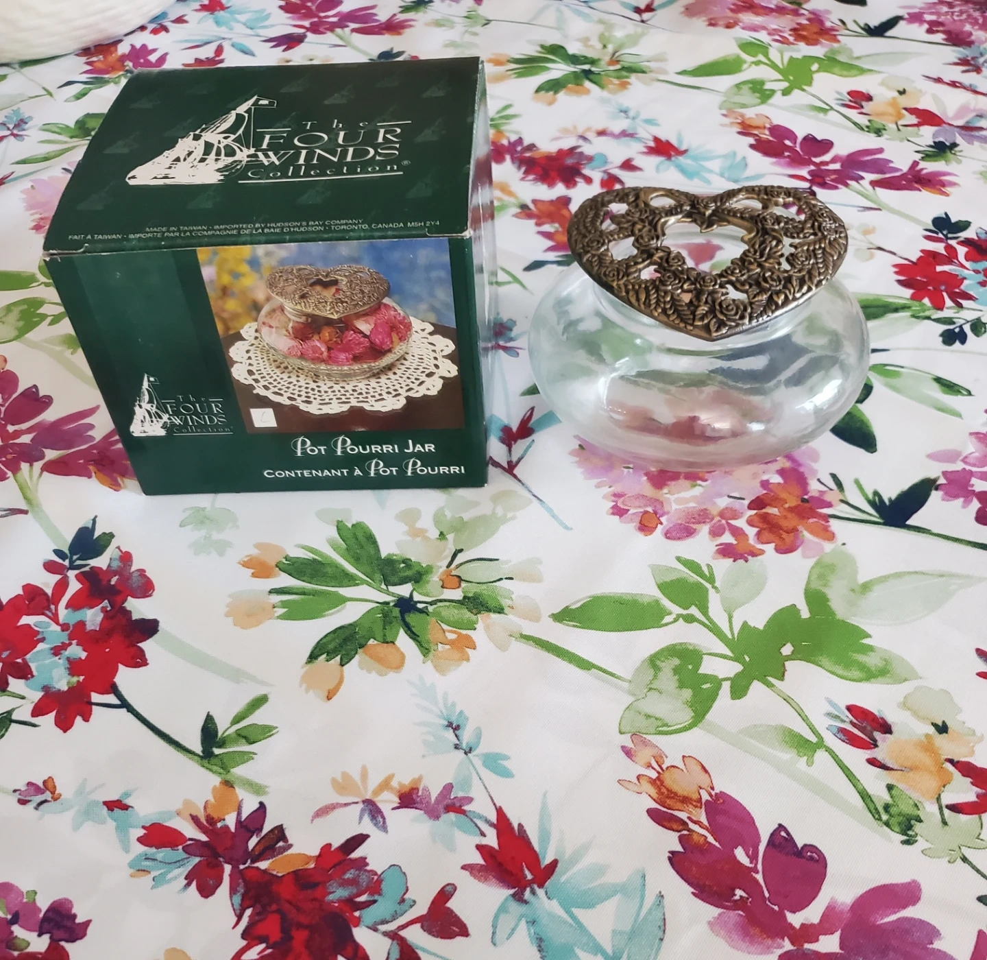 This is a vintage potpourri jar from The Four Winds Collection. It features a clear glass body and a decorative antique-look metal heart lid with floral details. It's great for displaying potpourri and adding a touch of vintage charm to any room. New never used still in original packaging.