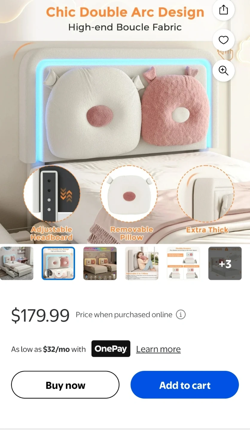 This Vipuse twin size bed frame features a modern upholstered design with LED lighting. It includes a storage drawer and a removable pillow for added comfort. The adjustable headboard offers personalized support.