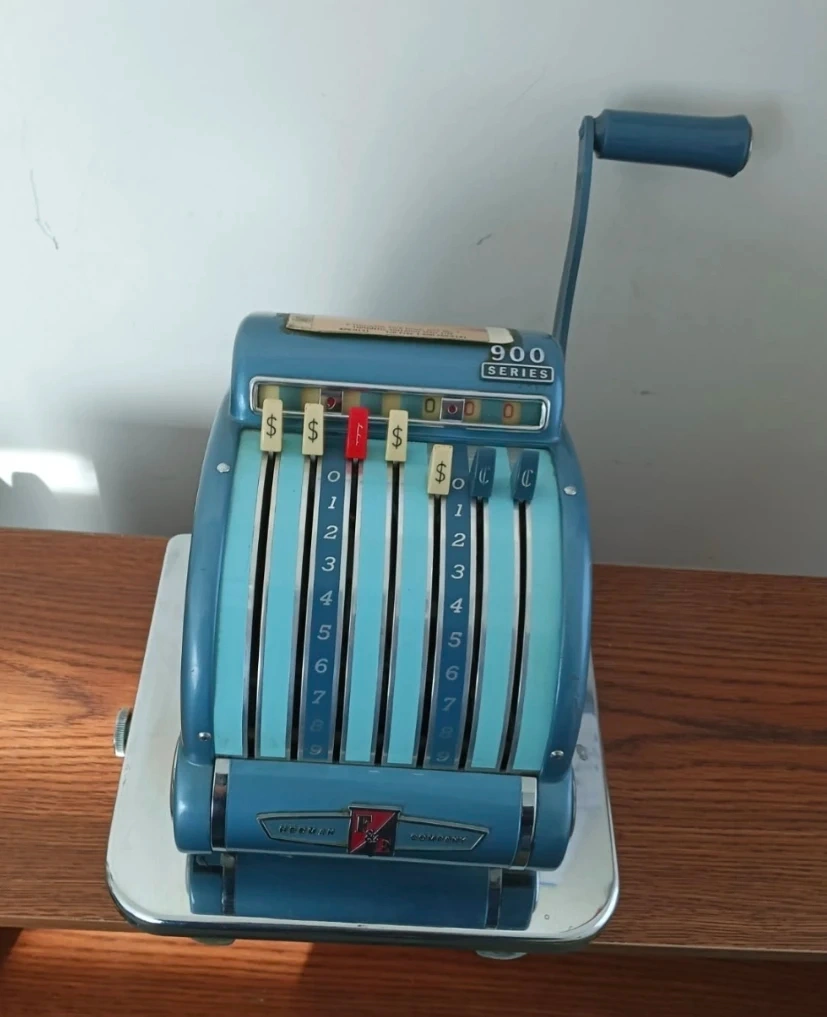 A vintage F&S Company 900 Series cash register in a striking blue colour. It features multiple price levers and a crank handle. This classic piece would be a unique addition for collectors or small businesses.