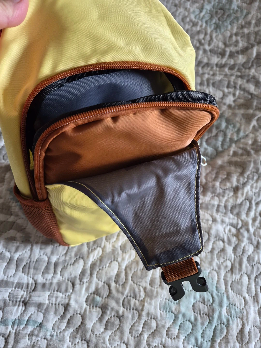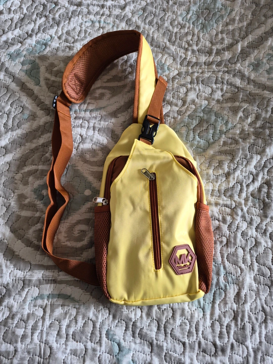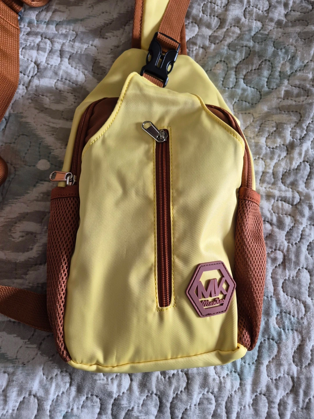 Mankar Yellow & Brown Sling Backpack Purse, Durable Nylon, Multiple Pockets, Buckle Closure Adjustable Straps Brand Bew without Tags