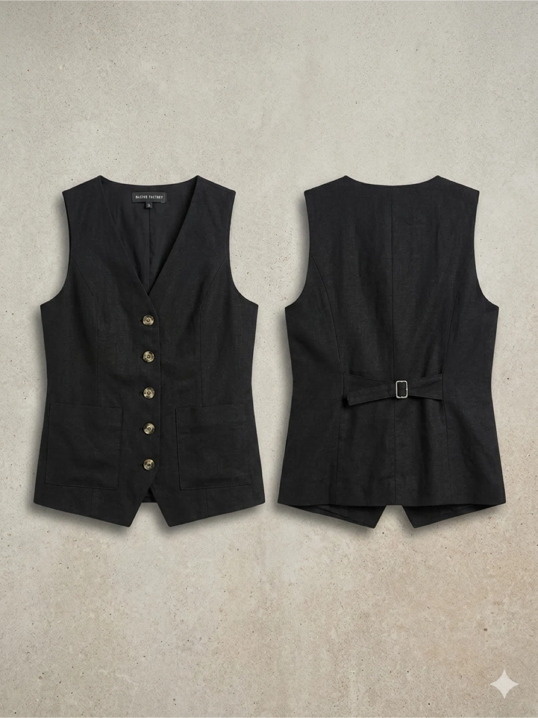 This is a black sleeveless vest from BLEIVE FACTORY. It's made with a linen-blend fabric and features a V-neck with button closures. Two front pockets add practicality. The back has an adjustable buckle detail for a customized fit.