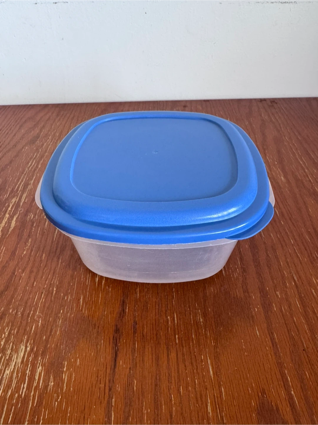This is a square plastic food storage container with a blue lid. It's suitable for storing leftovers or packing lunches. The container is made of clear plastic and the lid is a bright blue.