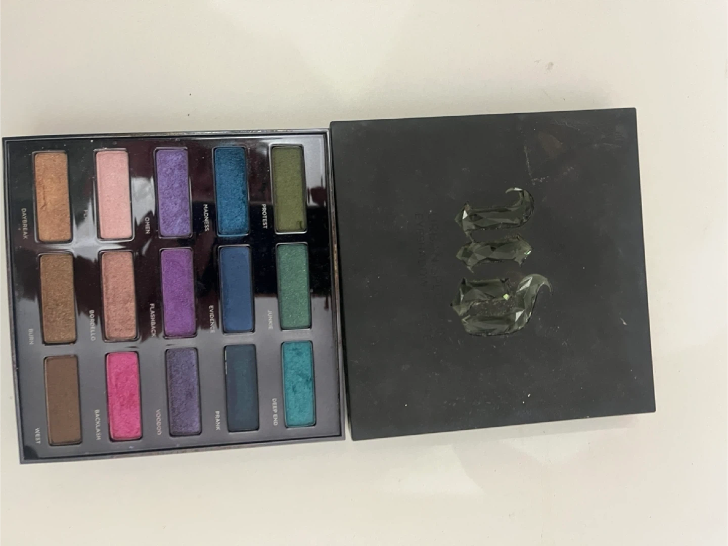Selling an Urban Decay eyeshadow palette with a variety of shades! The palette includes colours like Daybreak, Burn, West, Bordello, Backlash, Voodoo, Omen, Flashback, Madness, Evidence, Prank, Junkie, and Deep End