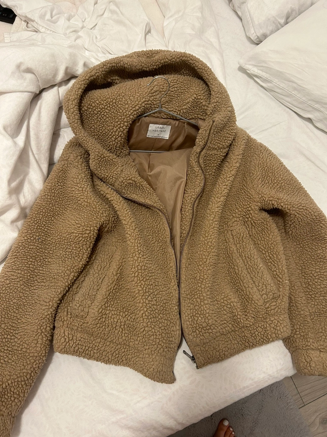 Women's brown teddy fleece zip-up jacket. Features a lined hood and full zip closure. Soft and cozy.