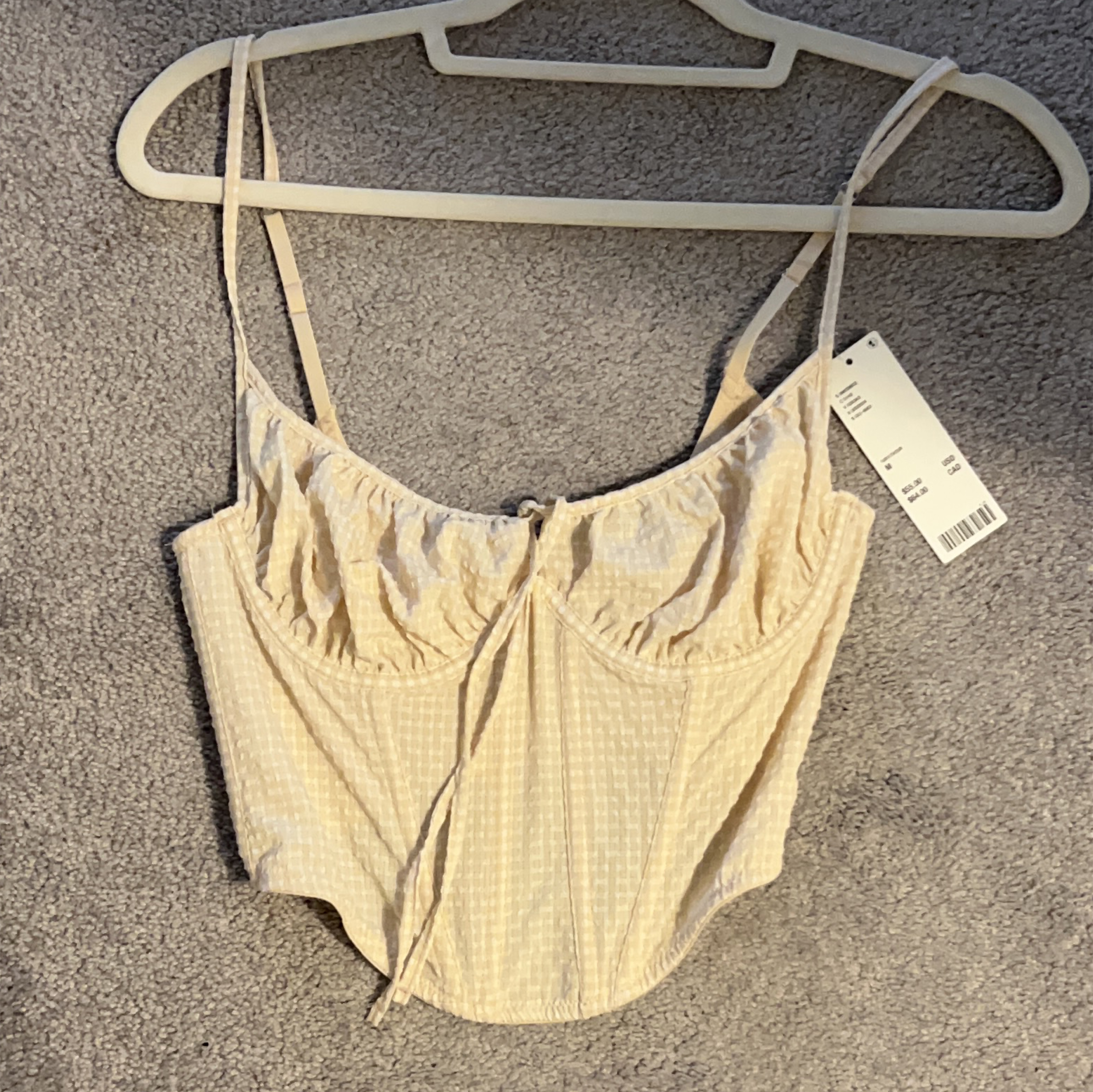31Selling an Urban Outfitters corset top in size medium! It's a cream colour with a textured pattern. Originally bought for $64 CAD, still has tags