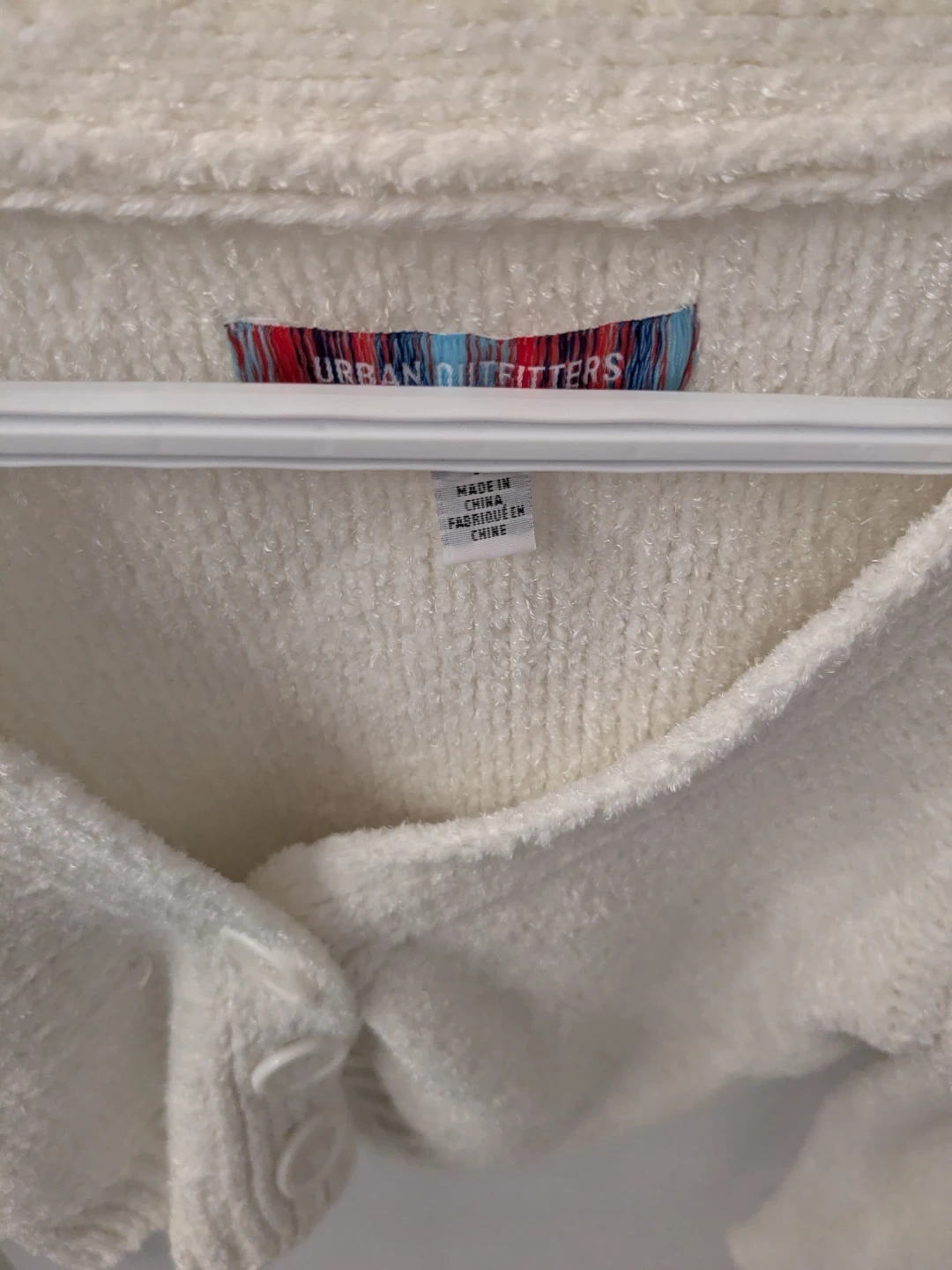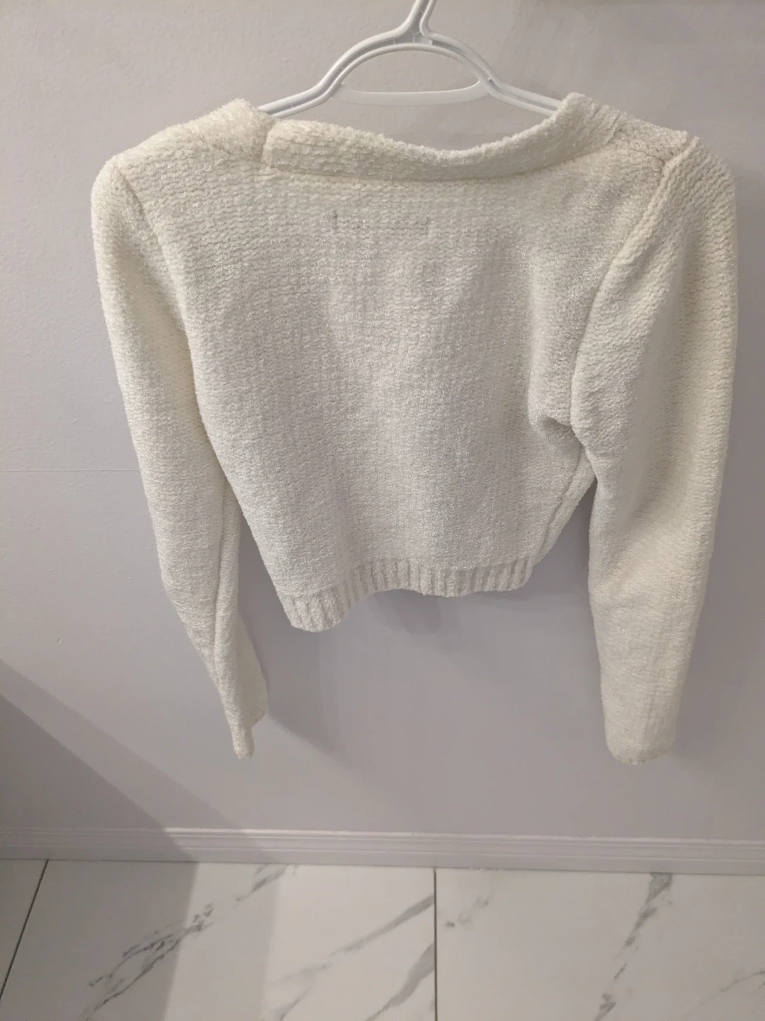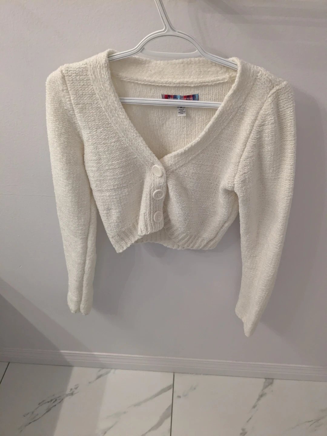 231Cozy up in this cropped cream-coloured cardigan from Urban Outfitters! It's a size small and perfect for layering or wearing on its own. It's in great condition and ready for a new home! Great condition
