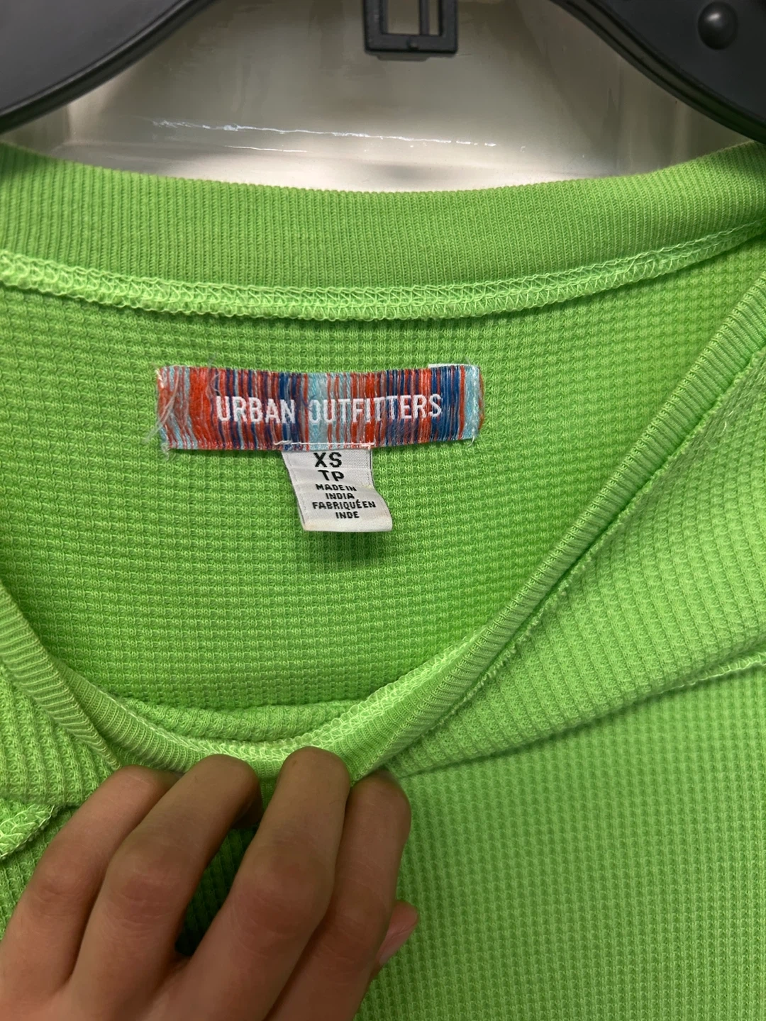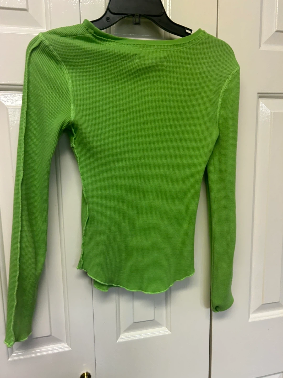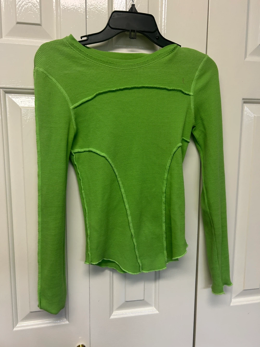 18Selling a cute Urban Outfitters long sleeve top in a vibrant green! It's a size XS and in great condition. The waffle knit texture and unique seam detailing make it a stylish and comfy piece for layering or wearing on its own