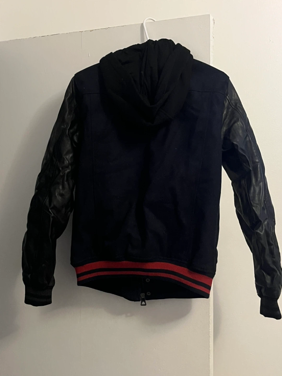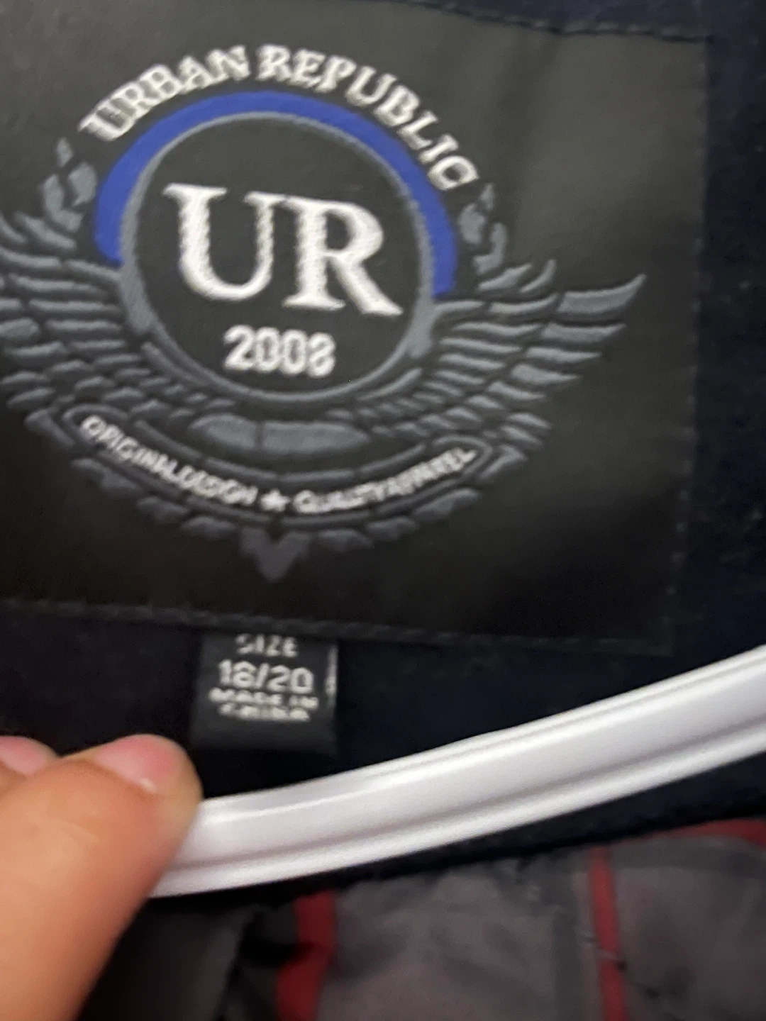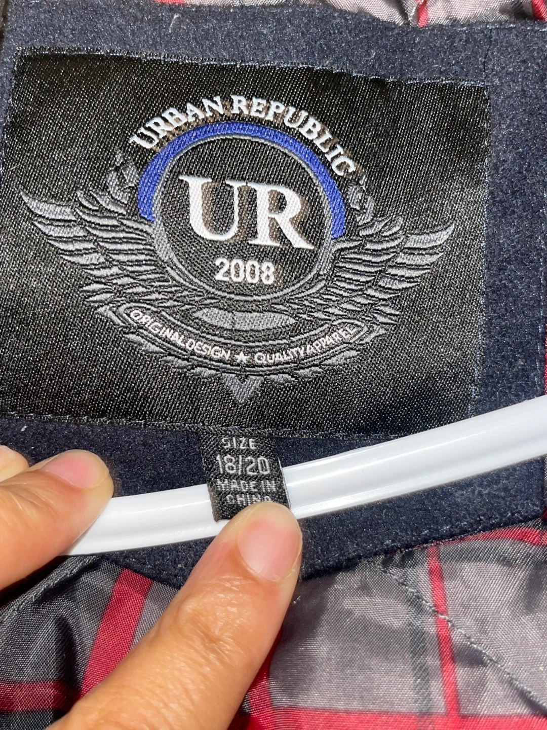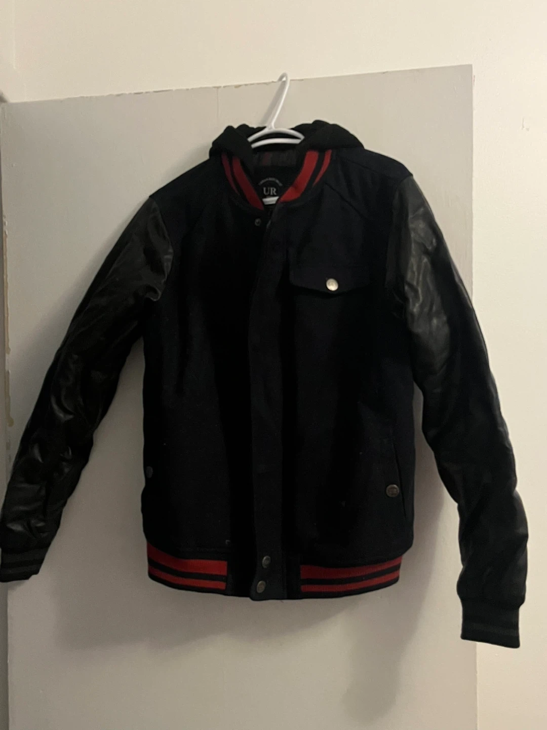 Urban Republic varsity jacket for sale! It's a size 18/20. The jacket is black with black faux leather sleeves and red and white detailing. Great for teens!