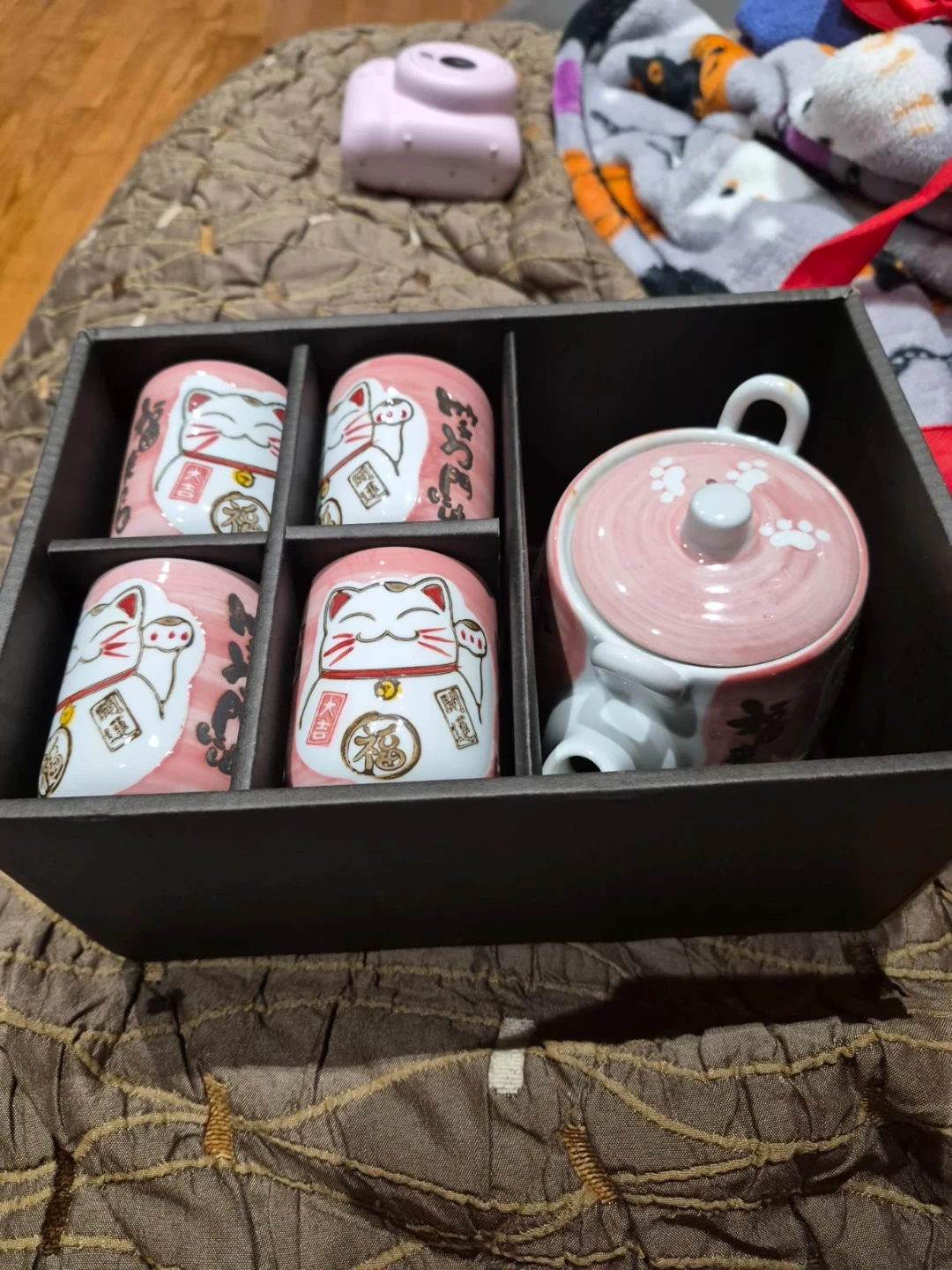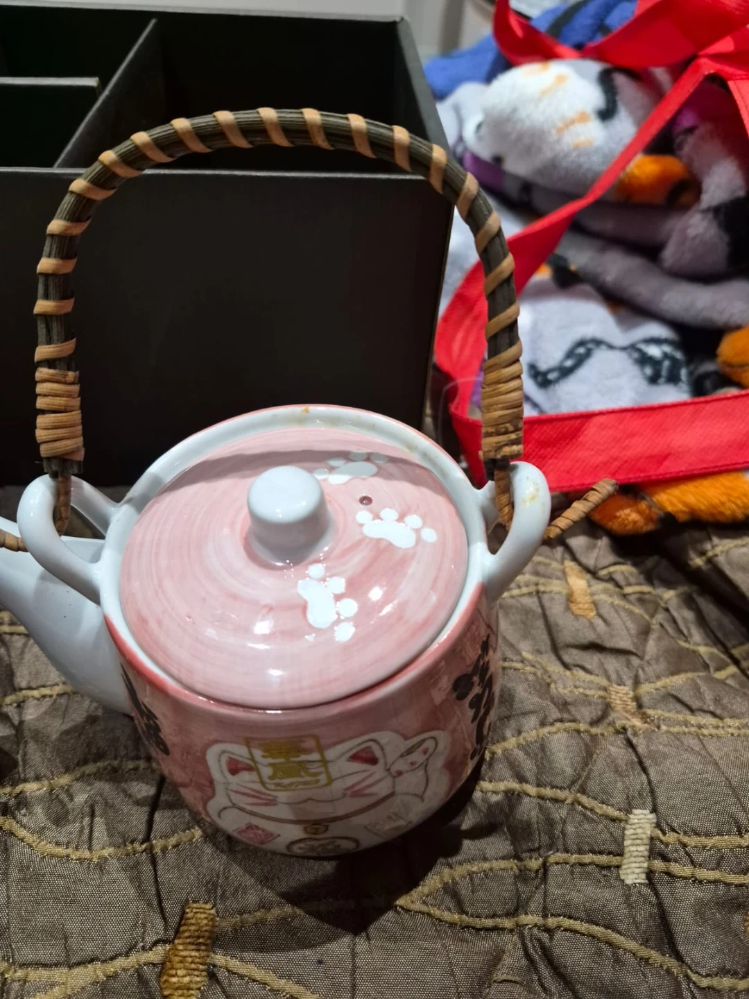 This set includes a teapot and four small cups, all decorated with the lucky Maneki Neko cat motif. The teapot has a charming woven handle, and the cups are a lovely shade of pink. It comes in a presentation box.