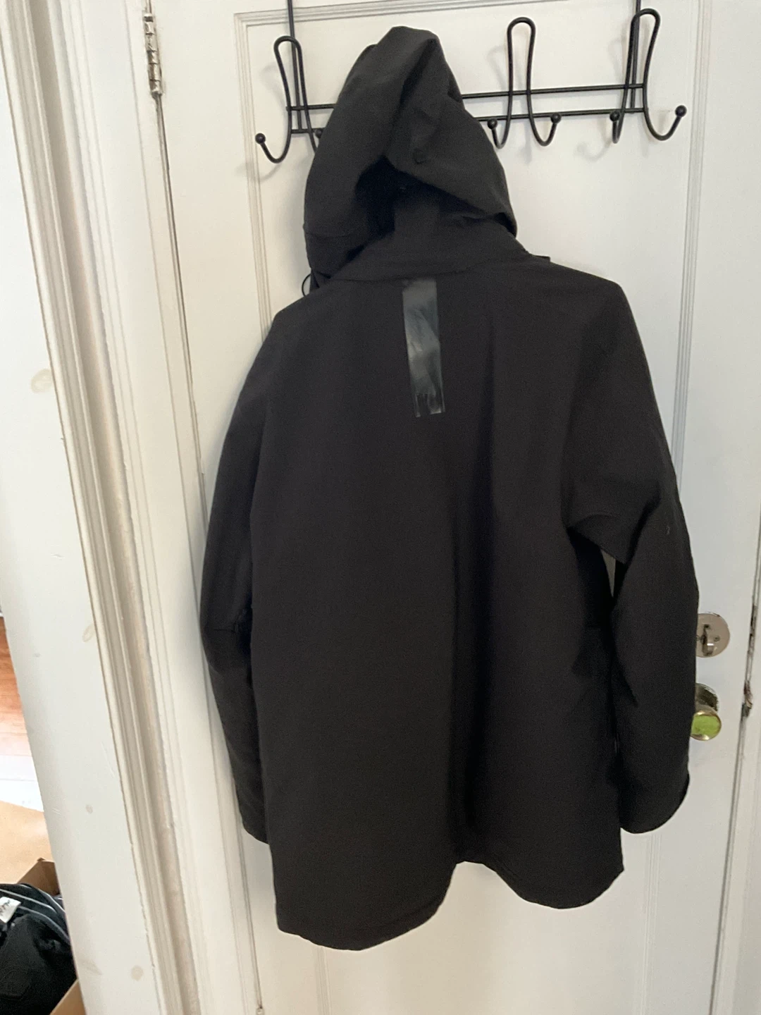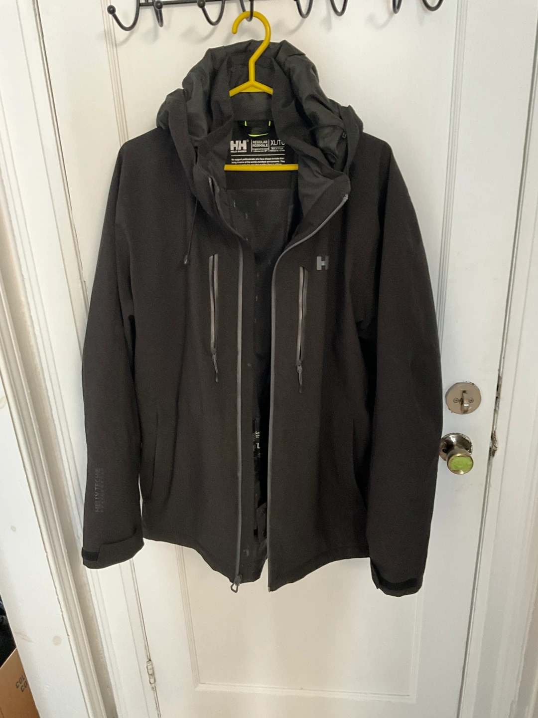 This is a men's Helly Hansen insulated waterproof jacket in black. It's an XL size with a hood and interior button up snow girdle. The jacket is made from durable, waterproof material.
