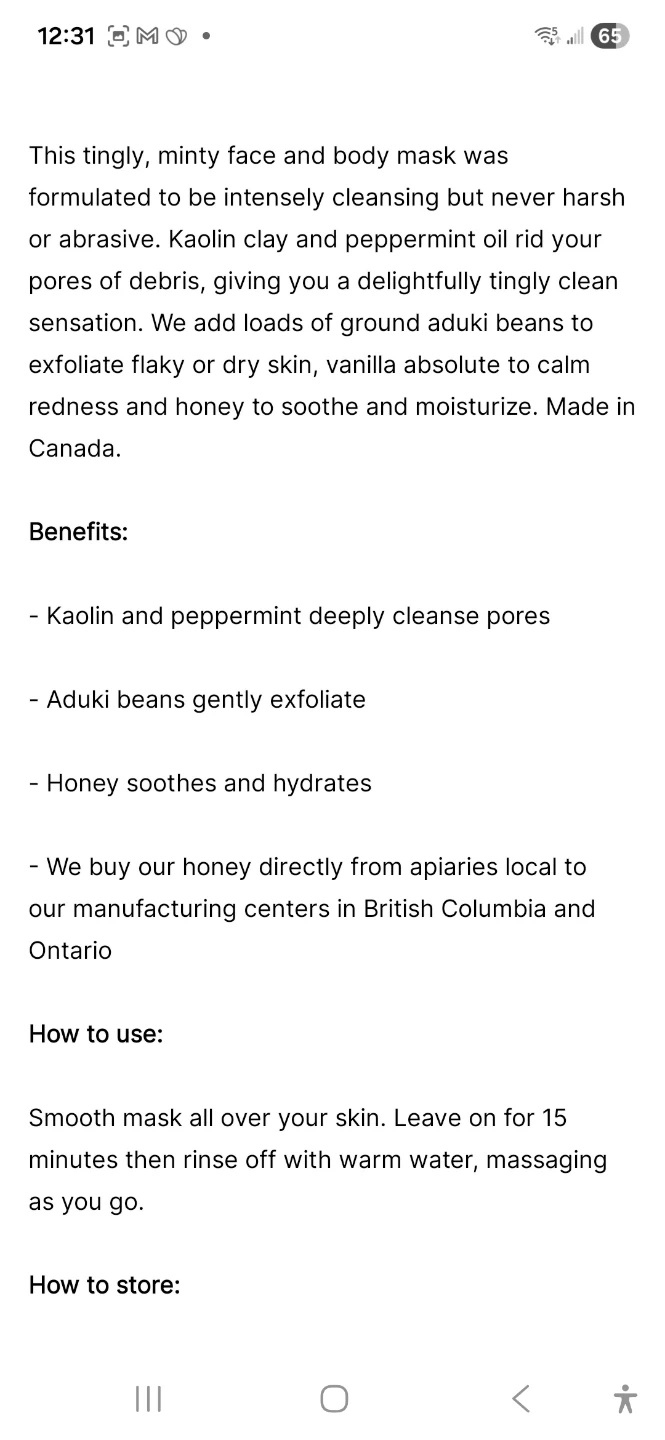 This tingly, minty face and body mask is packed full of peppermint, kaolin, and scrubby aduki beans for deeply cleansed skin. It's made in Canada. Kaolin and peppermint deeply cleanse pores, while aduki beans gently exfoliate. Honey soothes and hydrates.