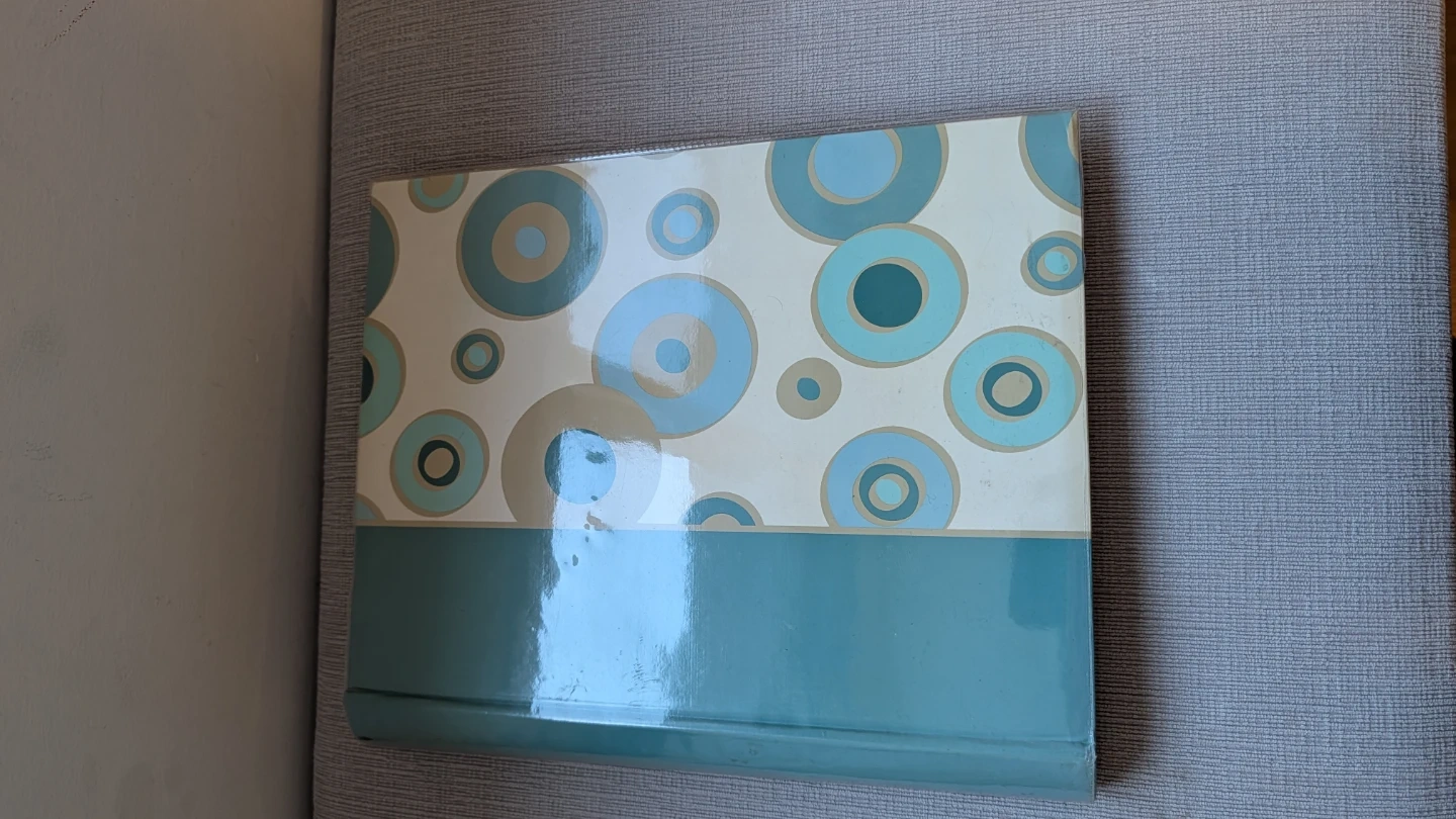 This photo album binder features a fun retro circle design in shades of blue and beige. It has clear protective pages for your photos. It's great for organizing your cherished memories!
