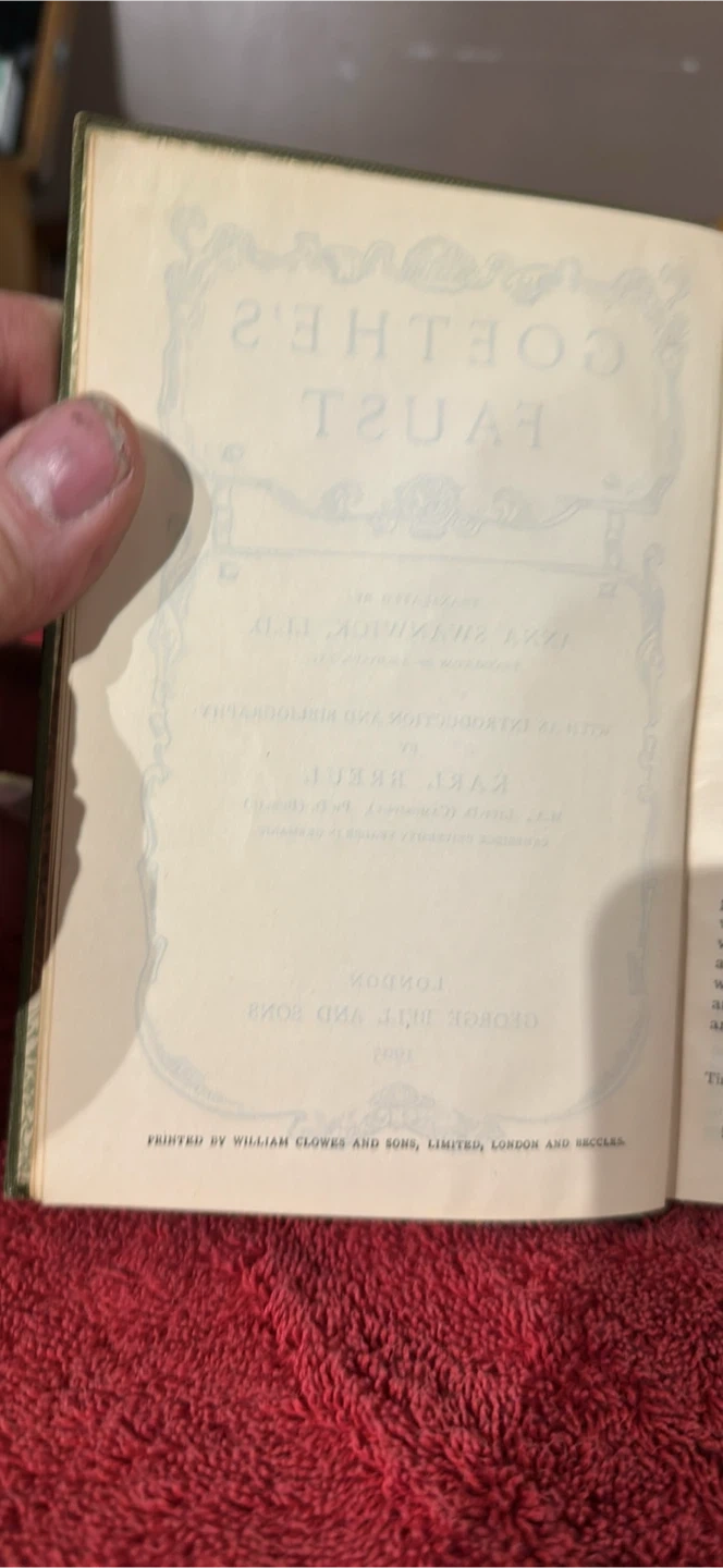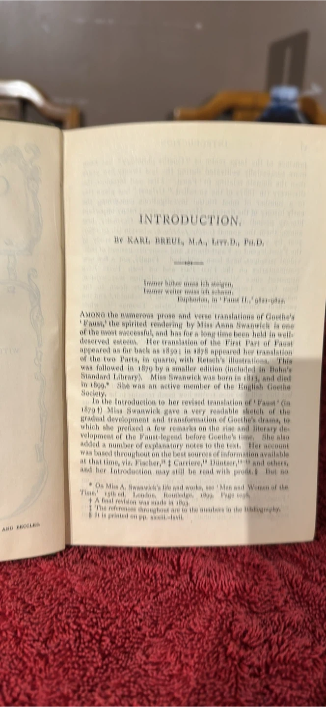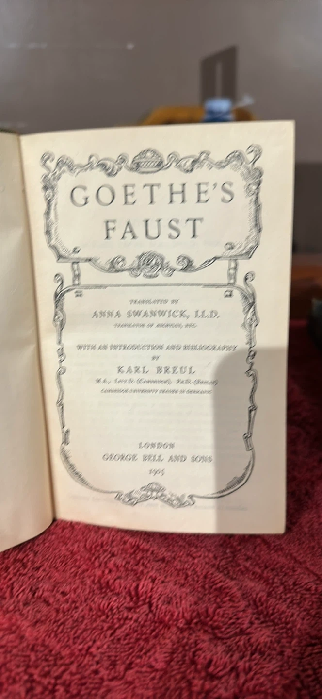 This is a hardcover edition of Goethe's Faust, translated by Anna Swanwick. It includes an introduction and bibliography by Karl Breul. Published in London by George Bell and Sons in 1905. It's a classic literary work.
