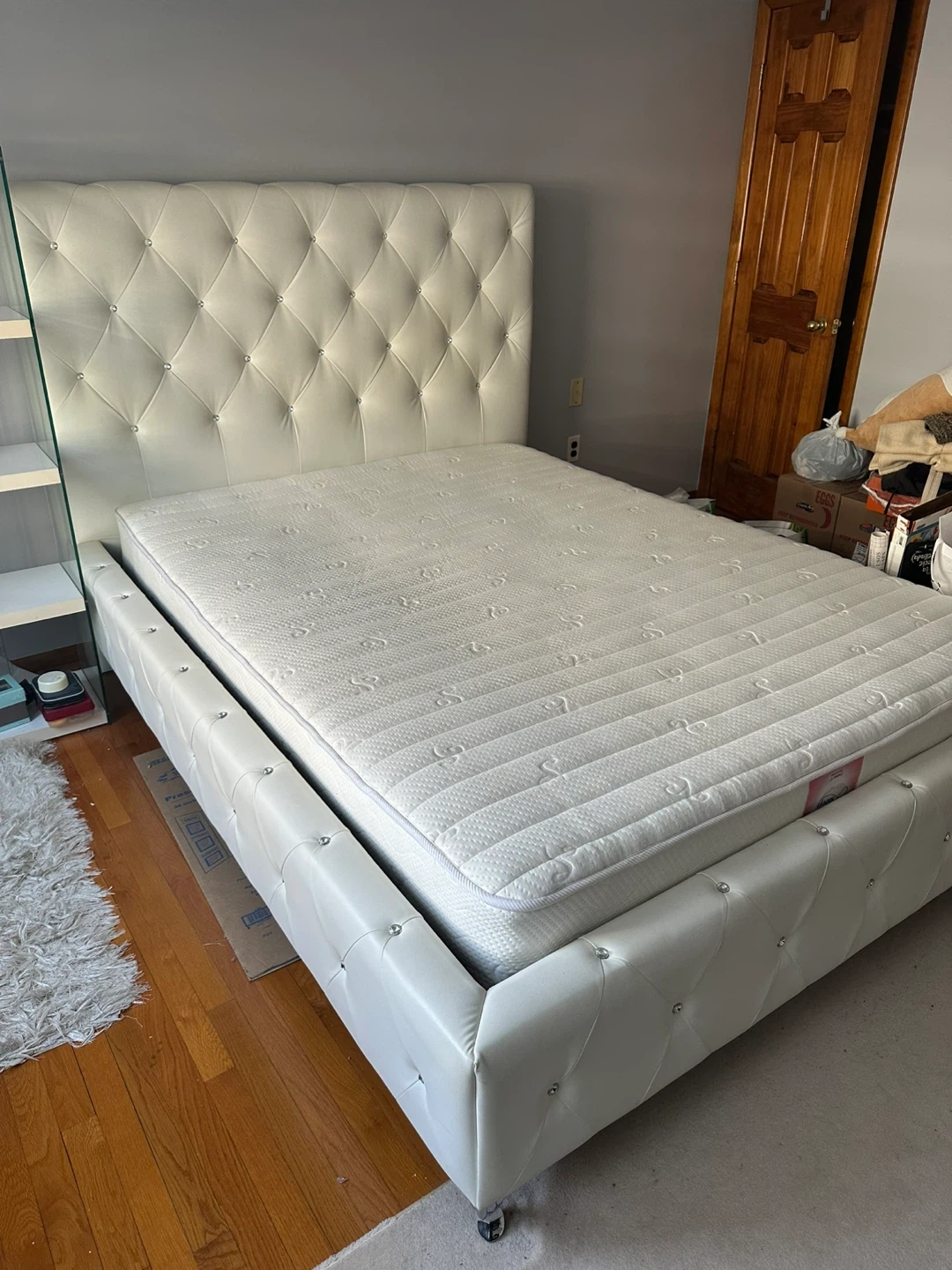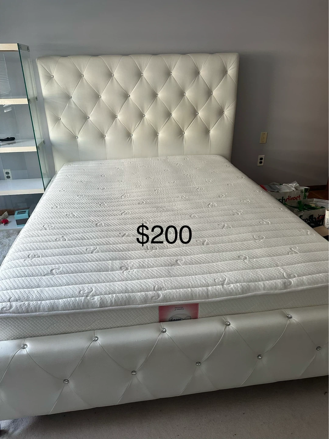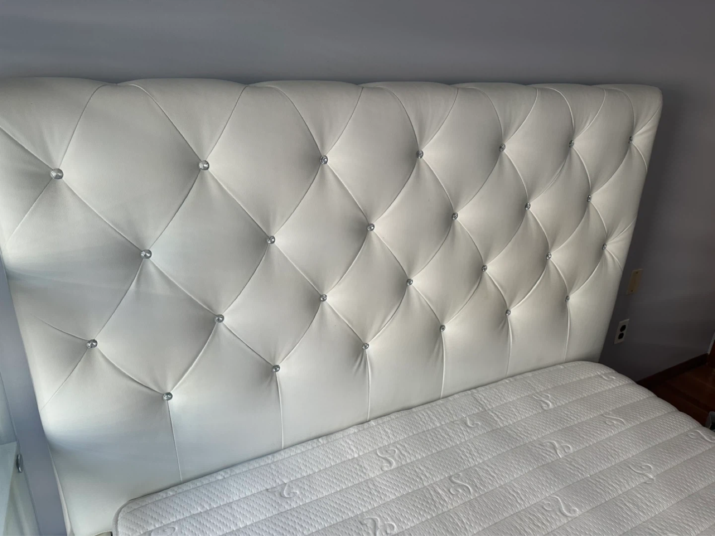 Cream/off white upholstered bed frame with diamond tufting and crystal button accents. Includes a white mattress with a subtle pattern. It's a stylish addition to any bedroom!