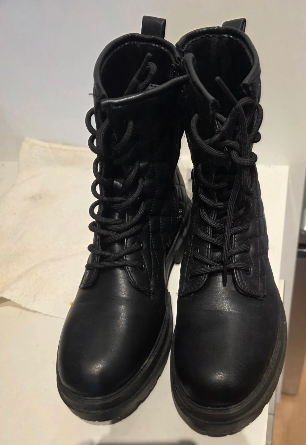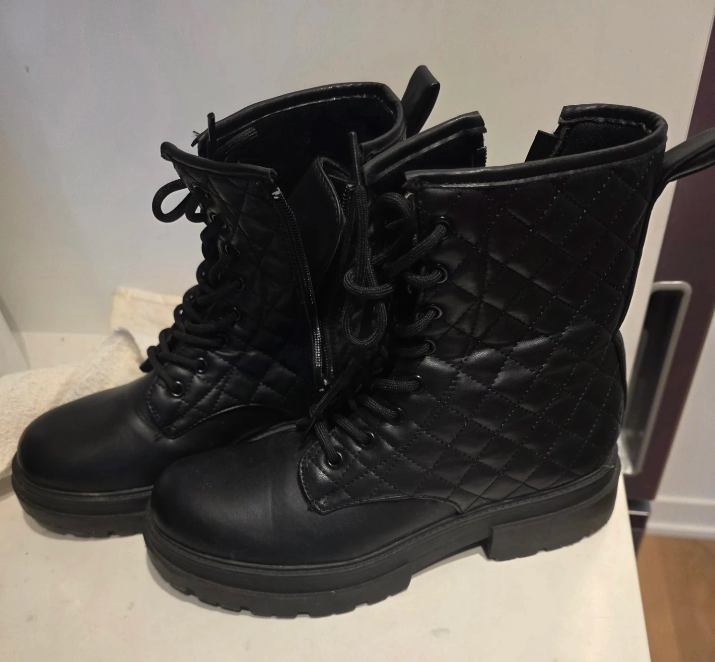 These black combat boots feature a quilted design on the shaft and laces. They have a sturdy sole and side zippers for easy on and off. Perfect for adding an edgy touch to any outfit!