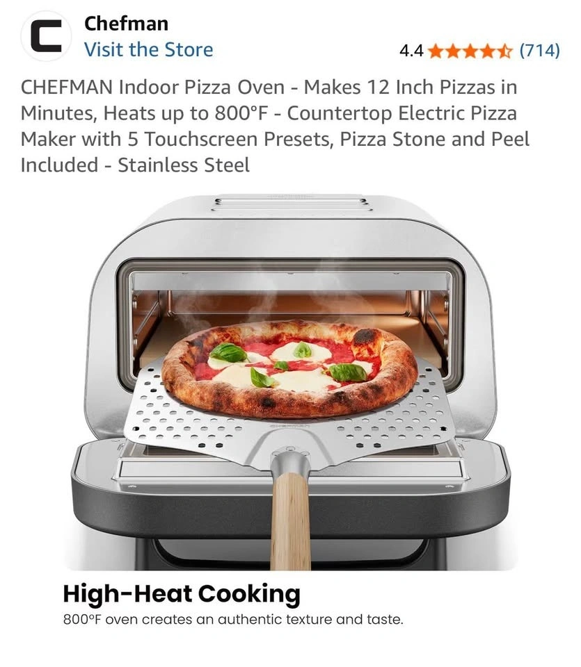 Brand new in the box! We're combining households and already have a pizza oven, so this one was an extra housewarming gift. It's a Chefman stainless steel pizza oven with a programmable touchscreen and 6 presets for different pizza styles (Neapolitan, New York, Thin-Crust, Pan, Frozen, DIY). It heats up to 800°F for quick, restaurant-quality pizza. It's compact for countertop use and includes a pizza stone, peel, and cookbook. We're happy for you to inspect and test it before you take it home to make sure you're satisfied. Once you pick it up, we can't be responsible for it.