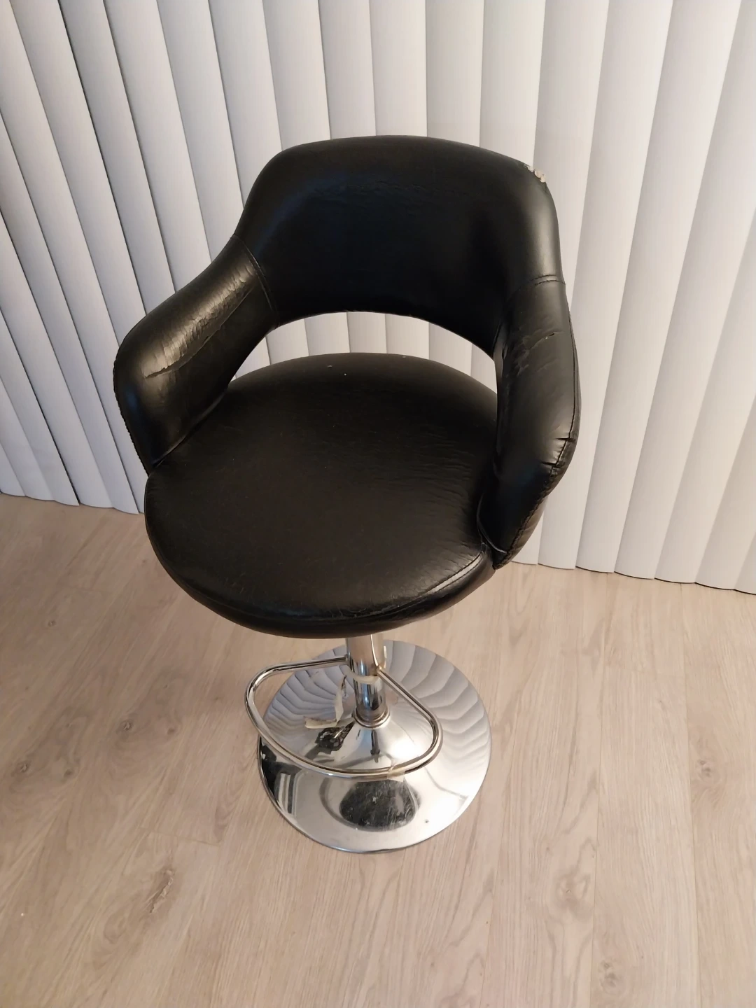 This is a black bar stool with a shiny chrome base. It features faux leather upholstery and a footrest ring. Adjustable height.