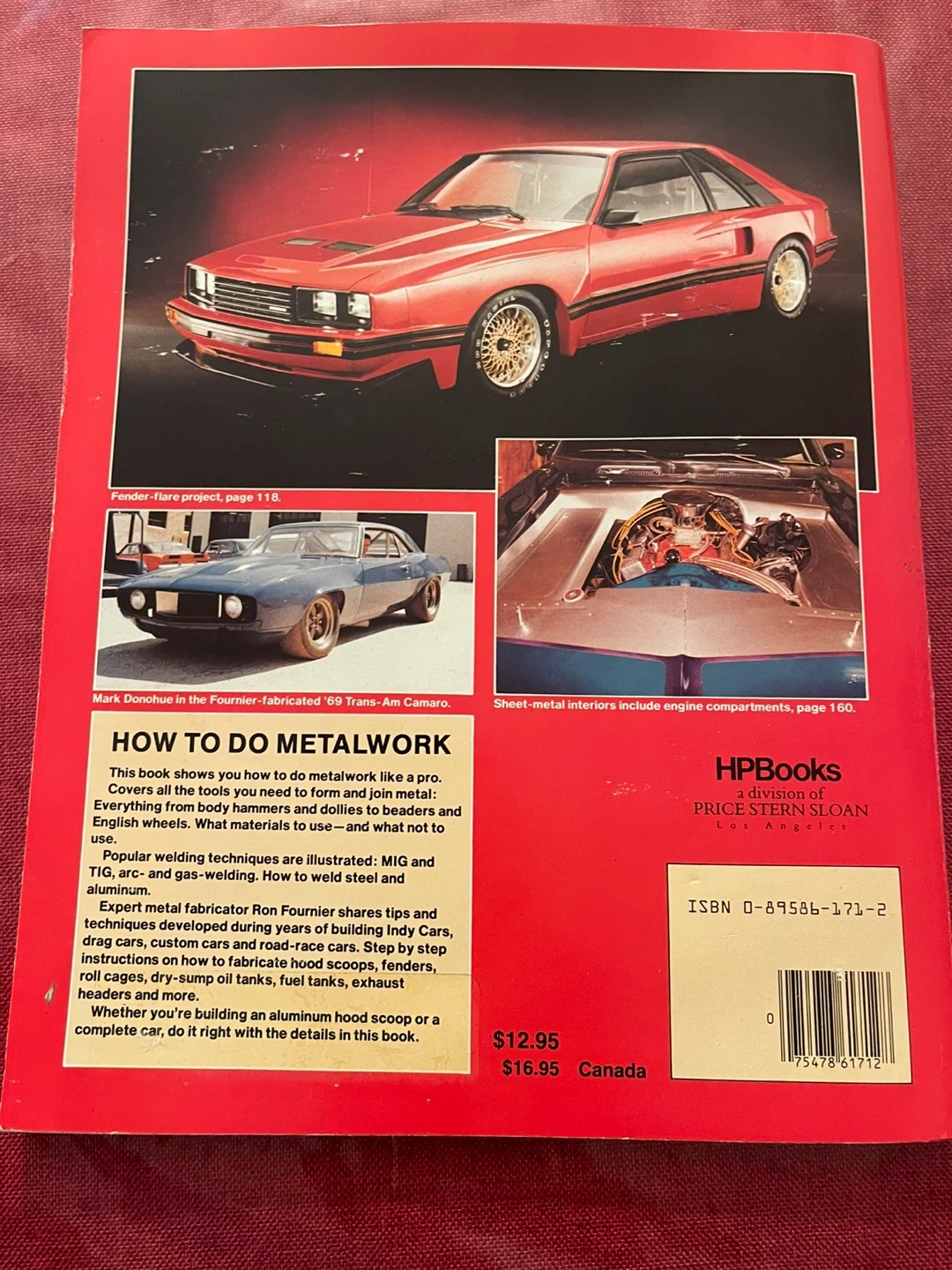 Selling a copy of "Metal Fabricator's Handbook" by Ron Fournier. It's a guide covering metalworking tools and techniques, including MIG and TIG arc and gas-welding. Perfect for anyone interested in race and custom car restoration, fenders, scoops, and spoilers. The book also includes practical data, formulas, and instructions. Cash only