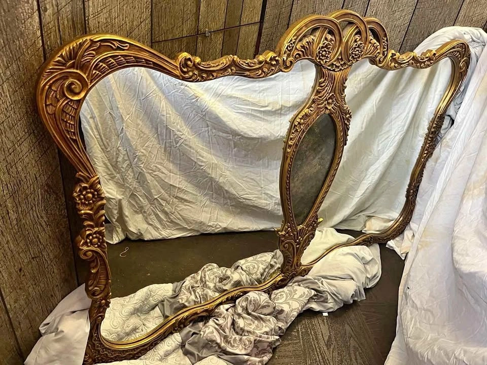 Vintage ornate gold dresser mirror features a stunning triple-pane design with intricate rococo-style carvings. The heavy frame showcases floral motifs and elegant scrolls, finished in a rich metallic gold. This statement piece adds a touch of Hollywood Regency glamour or French Provincial charm to any bedroom or vanity setup. The central oval section is flanked by two large shaped mirrors, creating a wide and dramatic silhouette perfect for mounting above a dresser or as a standalone wall feature. PICK ONLY FRANKLIN SQ.