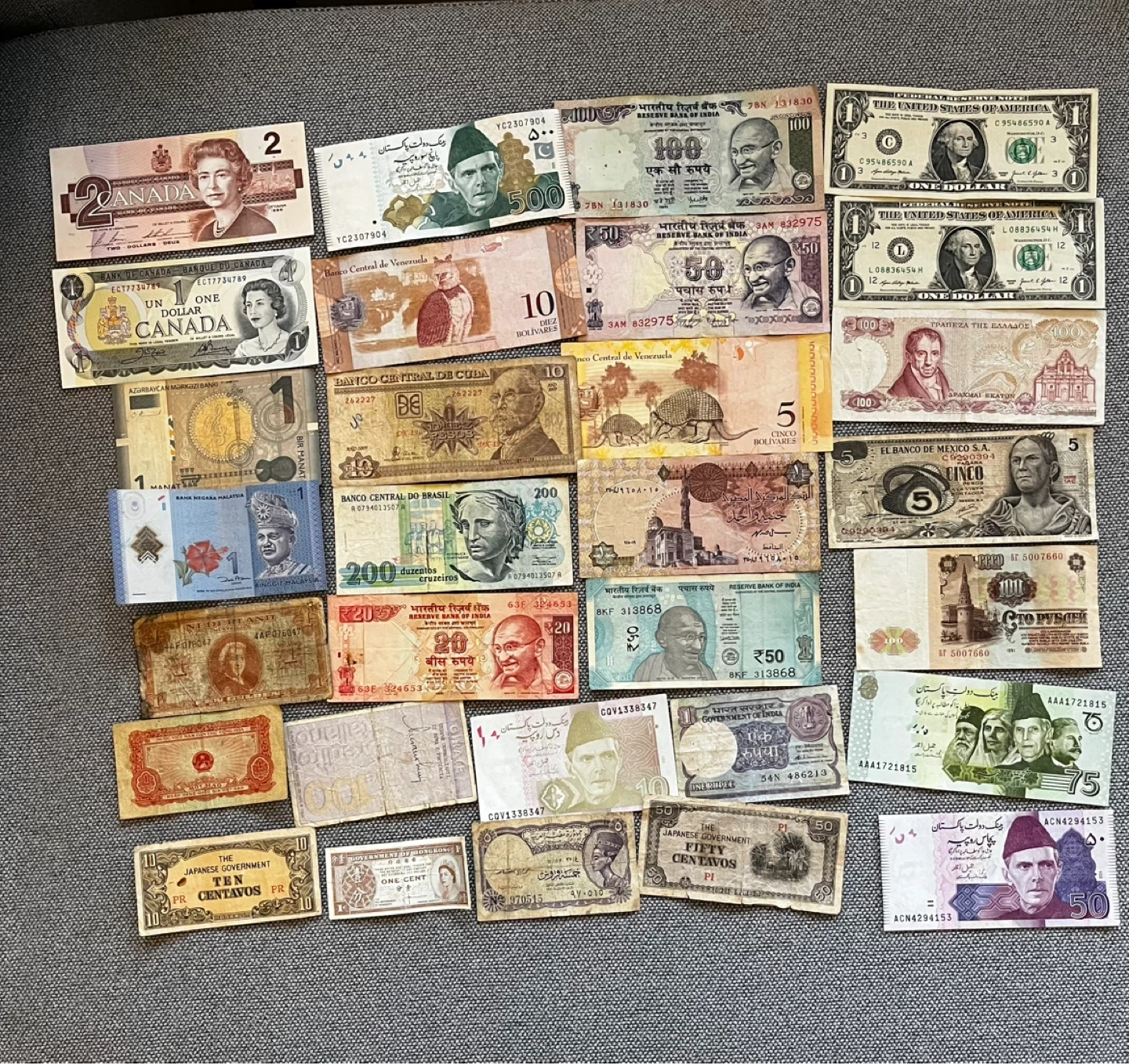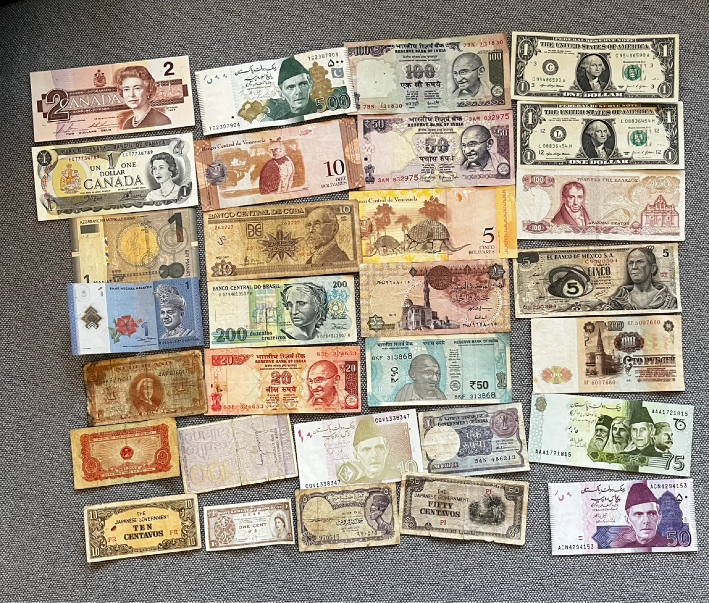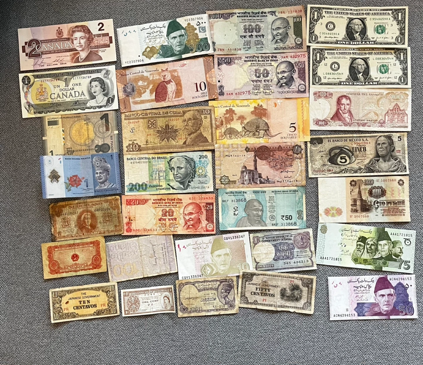 Every Single note more information about world ๐ This is a collection of various international banknotes. It includes currency from Canada, the United States, Pakistan, India, Cuba, Venezuela, Brazil, Mexico, and Japan. The bills vary in denomination and age.