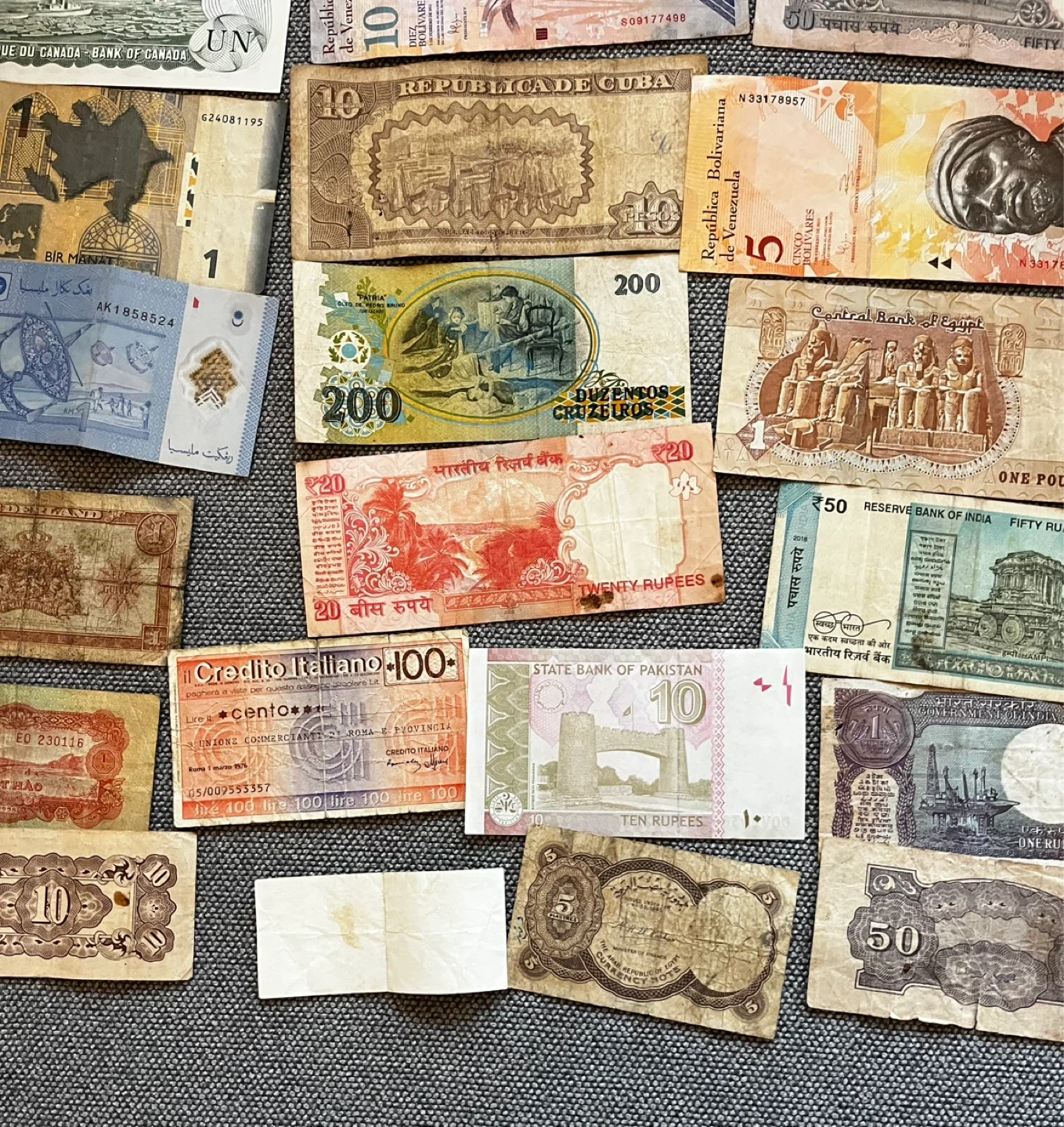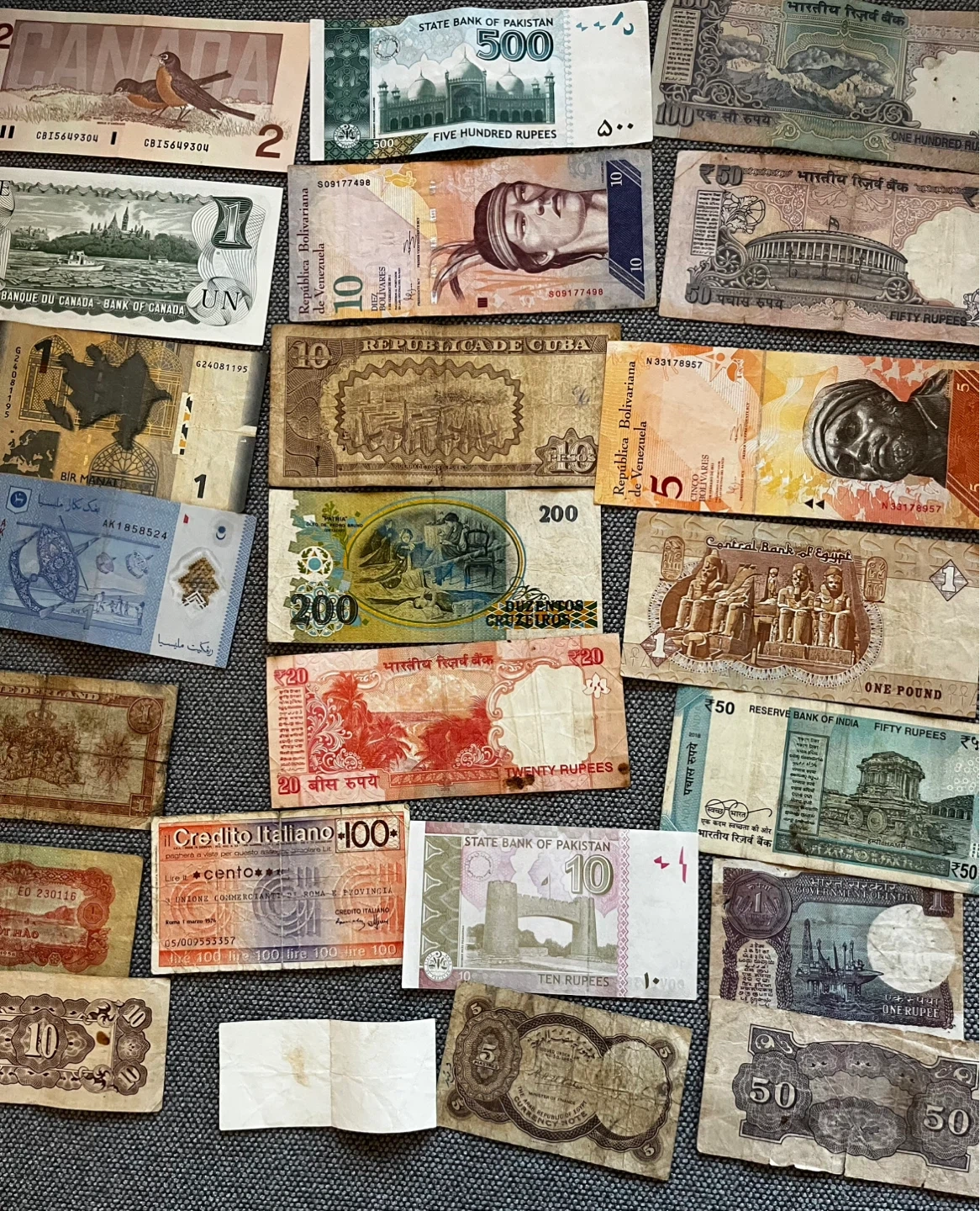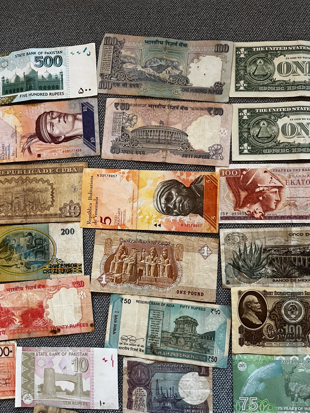Every Single note more information about world ๐ This is a collection of various international banknotes. It includes currency from Canada, the United States, Pakistan, India, Cuba, Venezuela, Brazil, Mexico, and Japan. The bills vary in denomination and age.