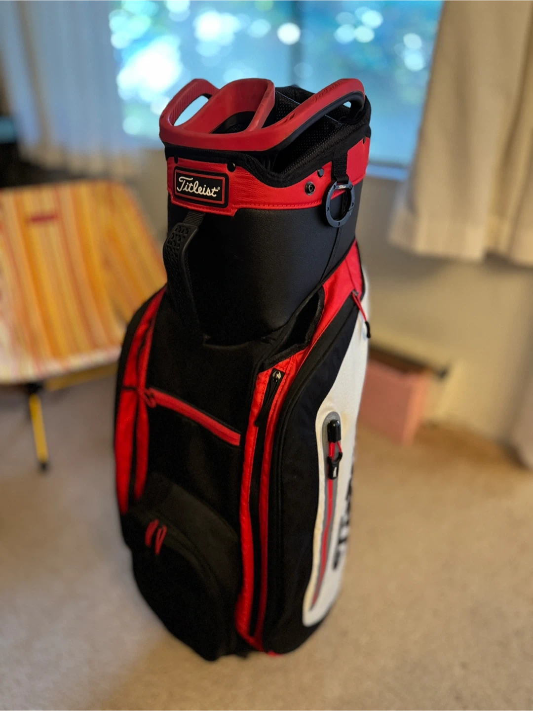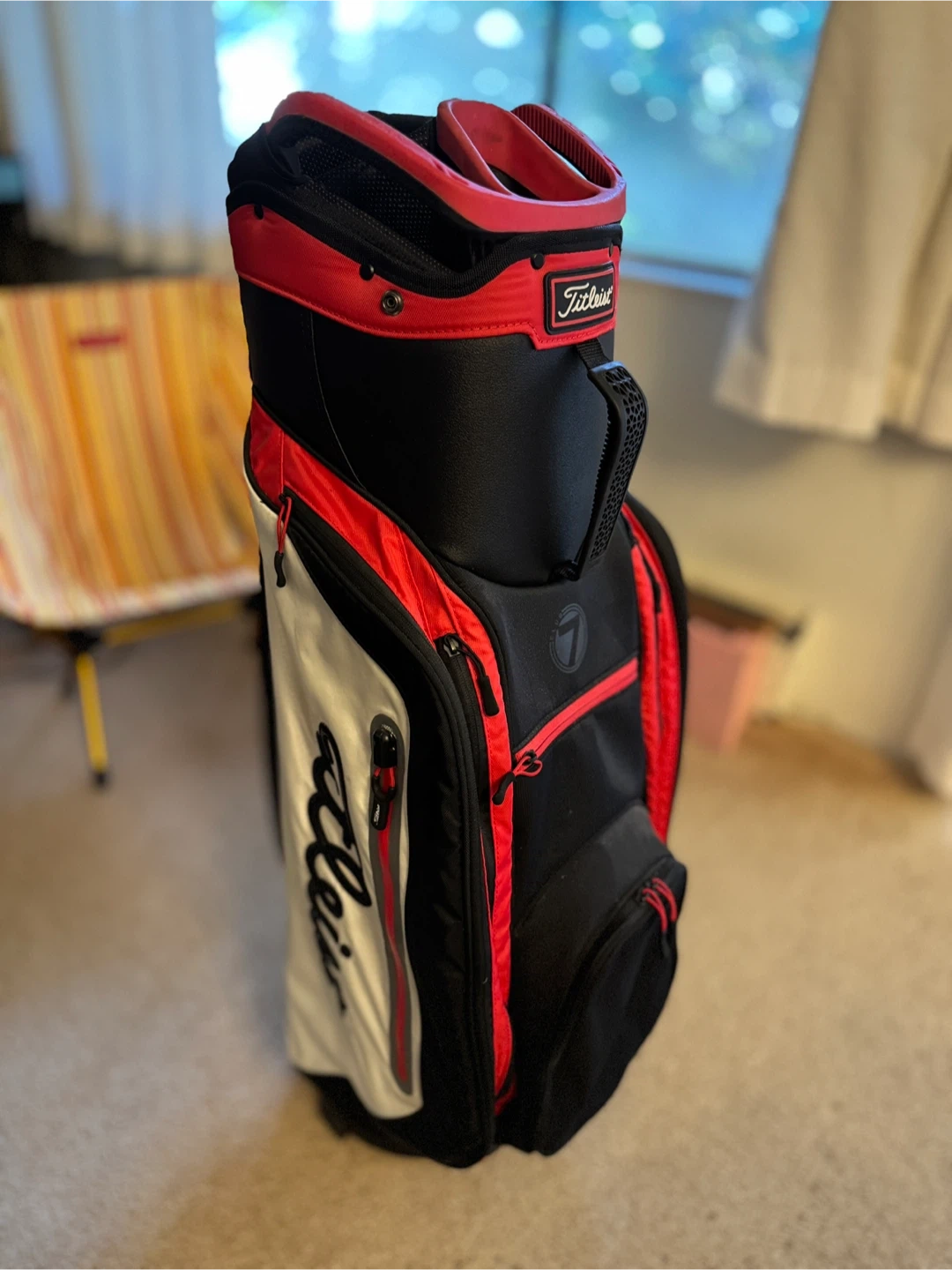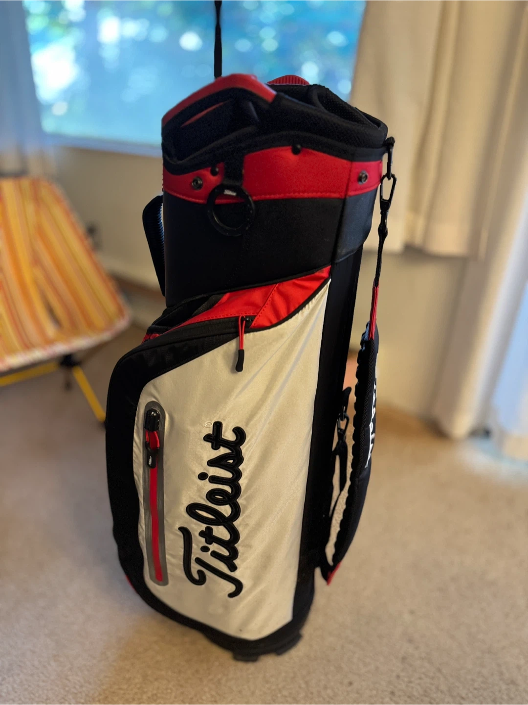 Black and red Titleist golf bag. It's got multiple zippered pockets for all your gear. Includes a sturdy handle and a shoulder strap.