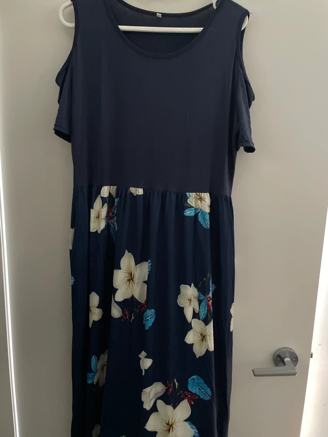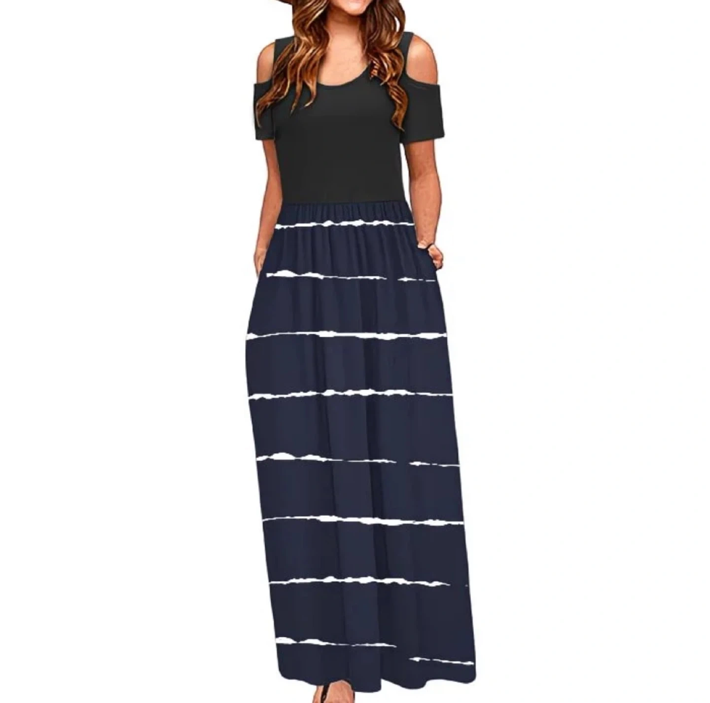 This cold shoulder maxi dress features a dark navy base with a vibrant floral print. It has a comfortable fit with short sleeves and a flattering flowy skirt. This dress is perfect for casual outings or summer events!