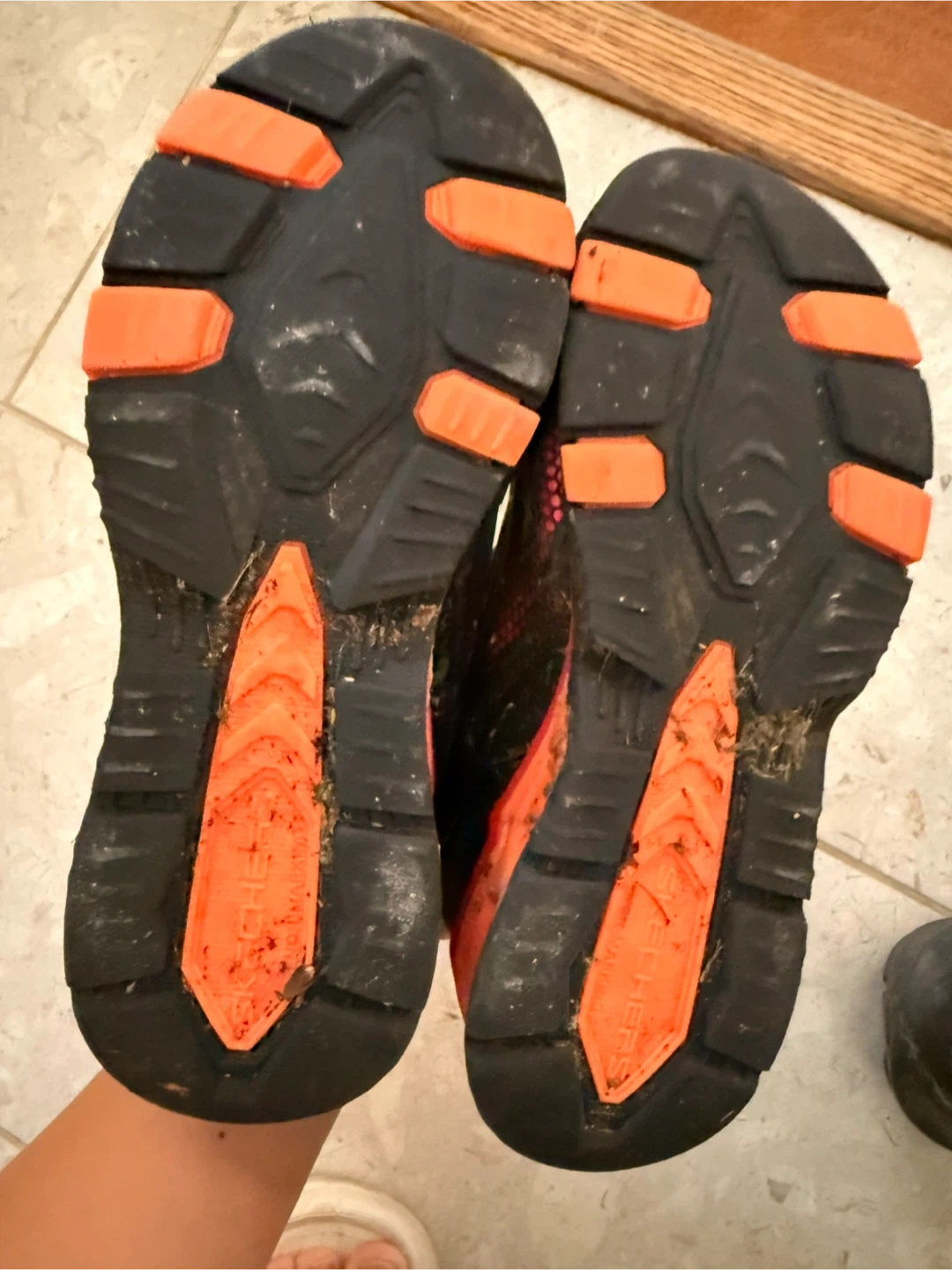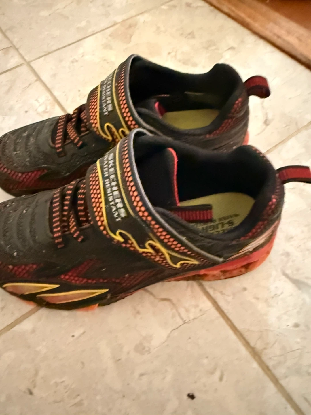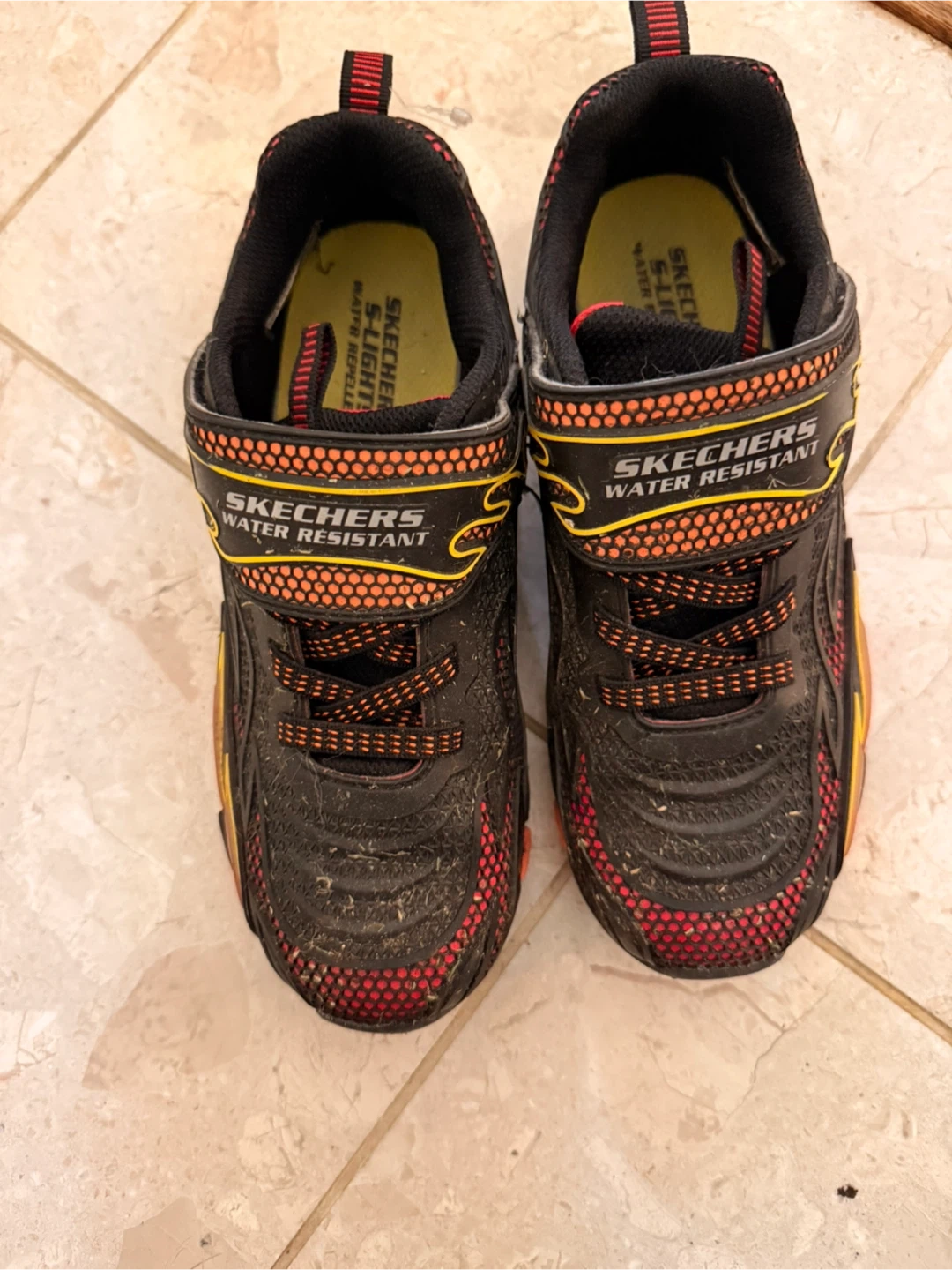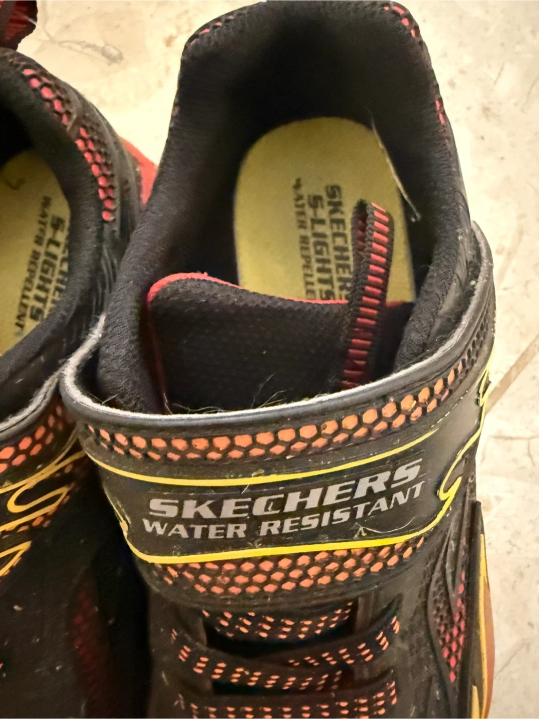 Selling a pair of Skechers S-Lights shoes. They are water resistant and have some wear and tear, as you can see in the photos. Great for kids who love to play outdoors! original price 89.99+tax