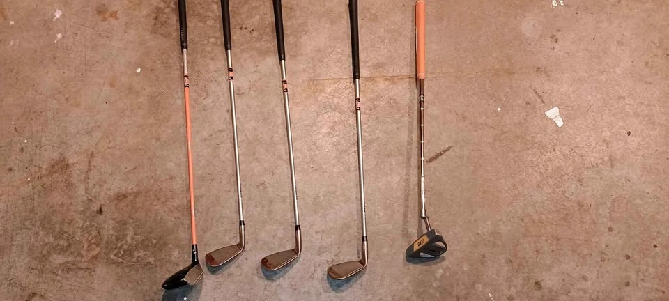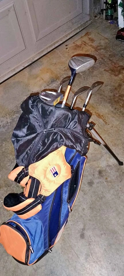 US Kids Youth USKG UL51 junior stand bag (orange/blue) sold with a full set of junior clubs. Lightweight 4-way top with full-length dividers, reliable integrated stand, padded dual strap, and multiple pockets. Ready to play for a junior golfer. - US Kids USKG UL51 junior stand bag - 4-way top with full-length dividers - Integrated spring-loaded stand; padded dual strap - Multiple zip pockets including insulated water pocket - Junior-sized (approx. 28" height) This includes everything to golf, including golf balls and some tees.