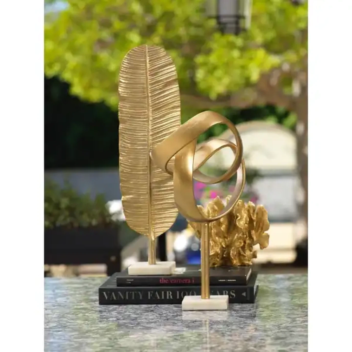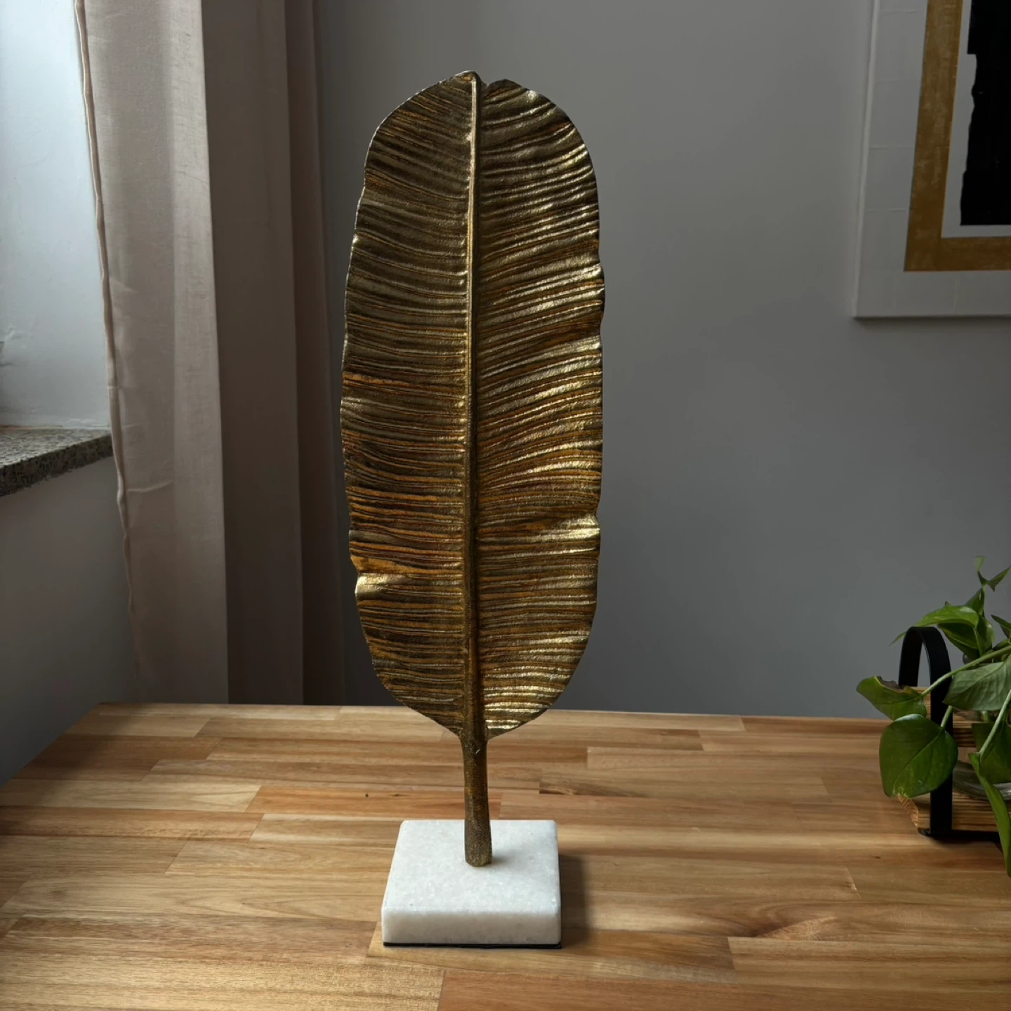 Add a touch of elegance to your space with this striking gold leaf sculpture. It stands on a stylish white marble base. Its textured metallic finish makes it a captivating decorative piece.