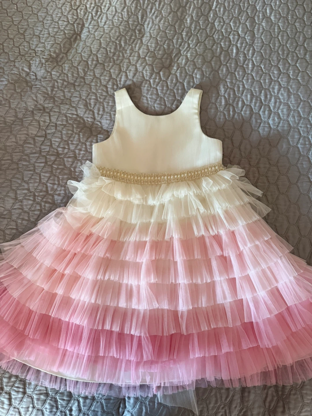A beautiful sleeveless dress for girls featuring a white bodice and a tiered, ombre tulle skirt fading from light pink to deep pink. It's accented with a delicate pearl-beaded waistband. This dress would be lovely for parties or special occasions!