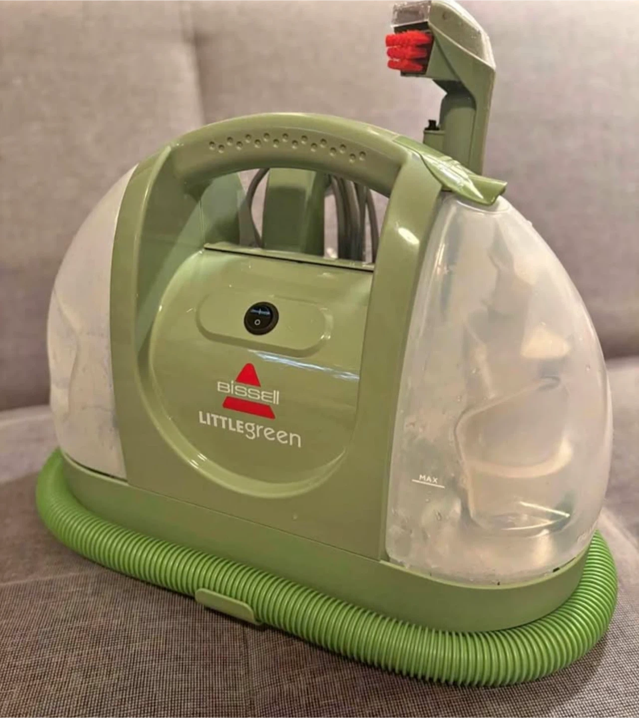 This is a Bissell Little Green portable carpet and upholstery cleaner. It's compact and lightweight for easy transport. The built-in hose and cleaning tool make spot cleaning simple.