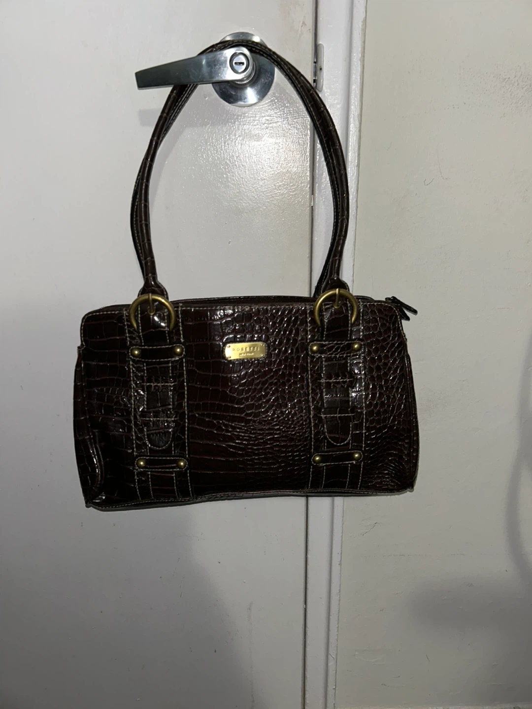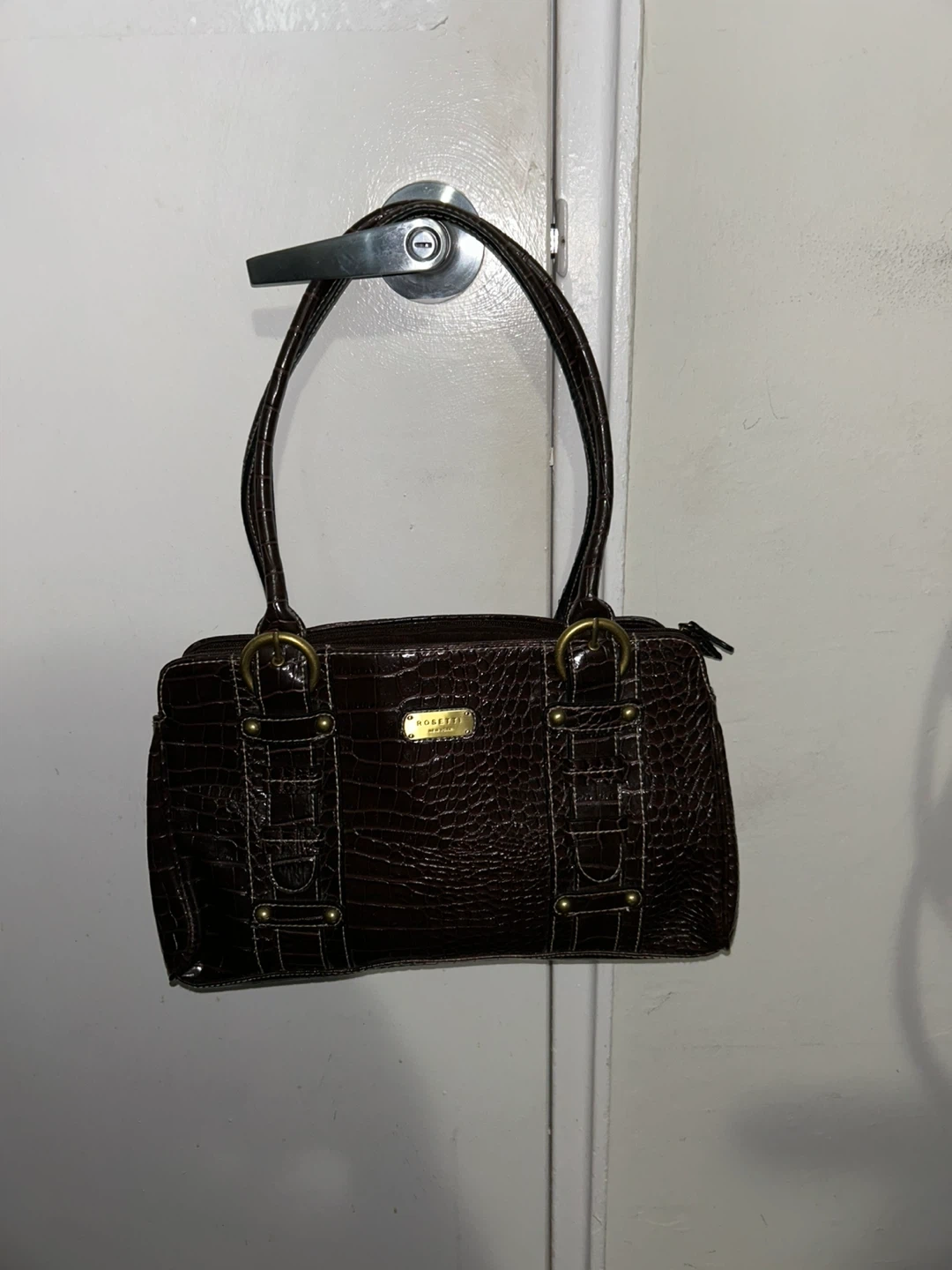 Rosetti handbag in a dark brown croc-embossed pattern. gold-tone hardware. Like new, great condition
