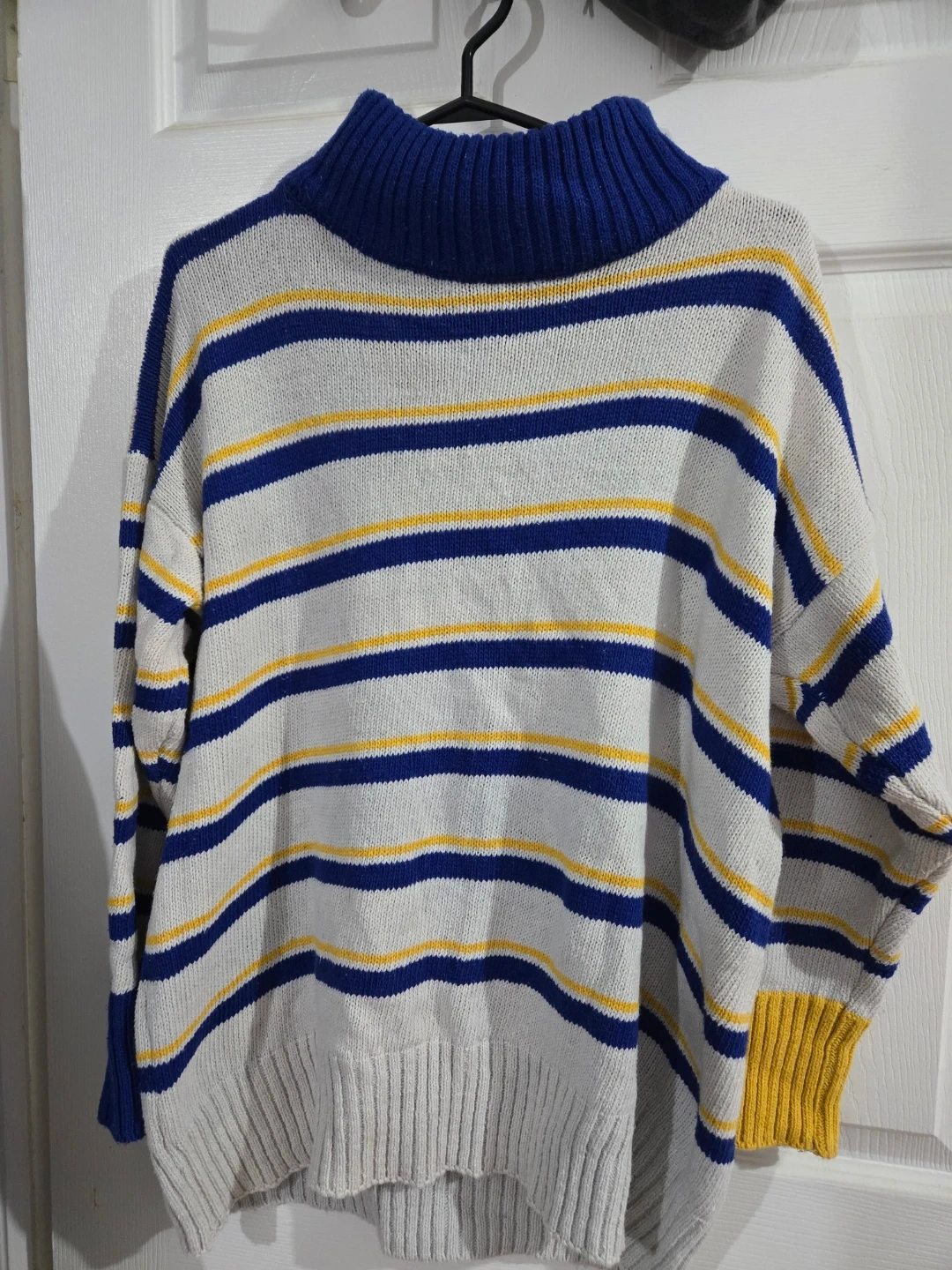 Cozy turtleneck sweater with blue and yellow stripes. It's made from a soft knit material. This sweater is great for cooler weather!
