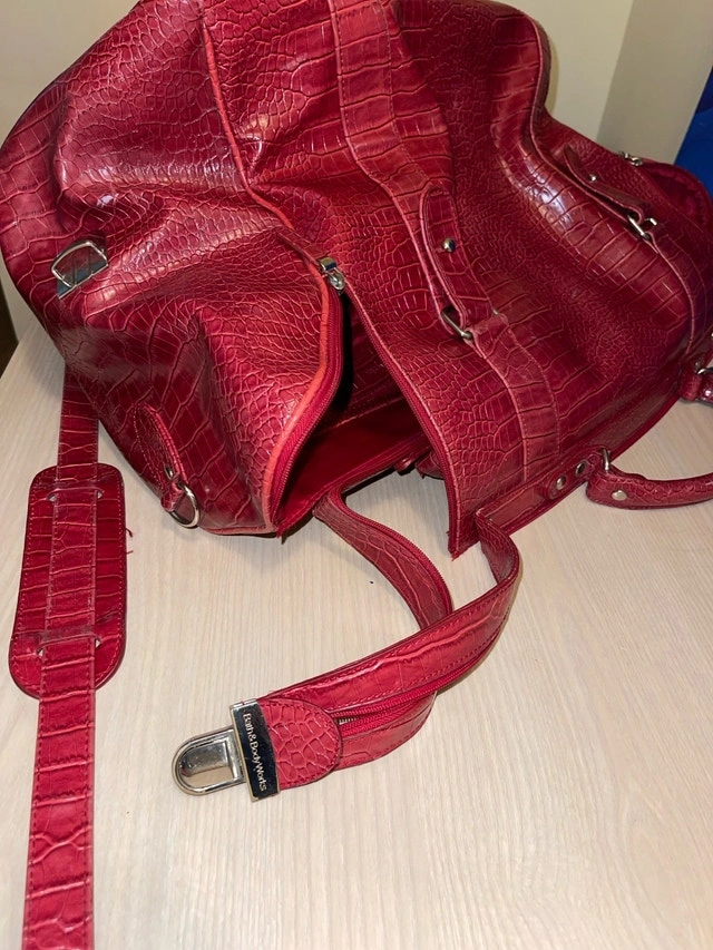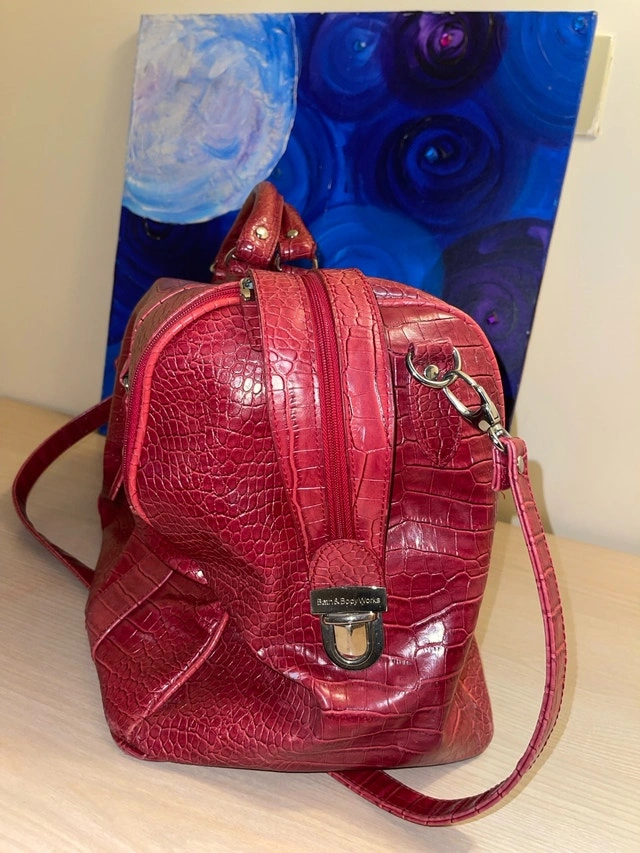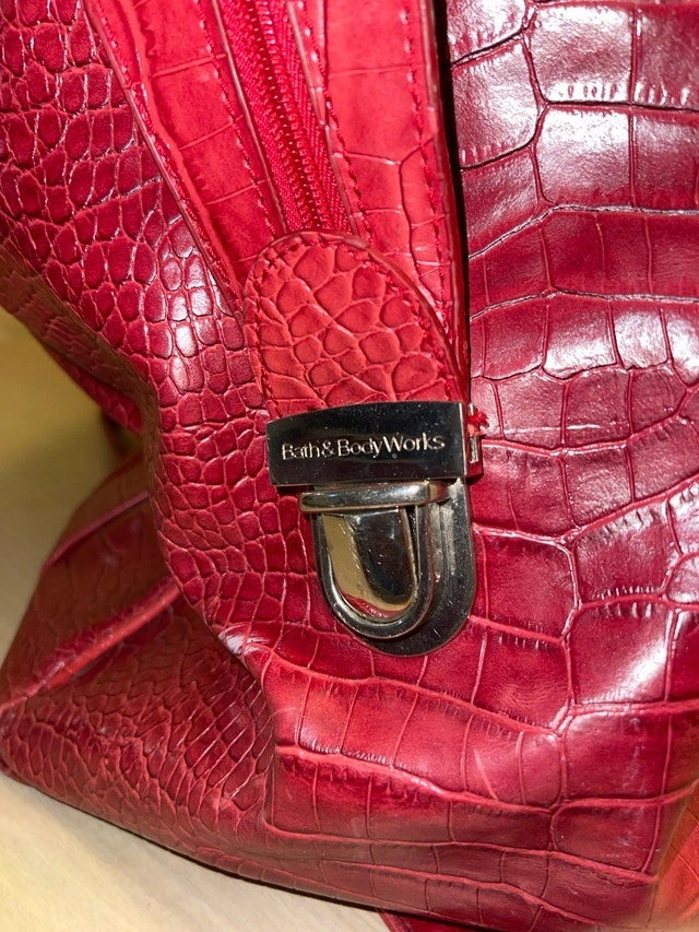 I'm selling a stylish Bath & Body Works satchel, perfect for travel or everyday use, featuring a chic red crocodile pattern. This is a used item. Brand: Bath & Body Works, Colour: Red, Pattern: Crocodile. If the ad is up, the bag is available. Cash accepted.