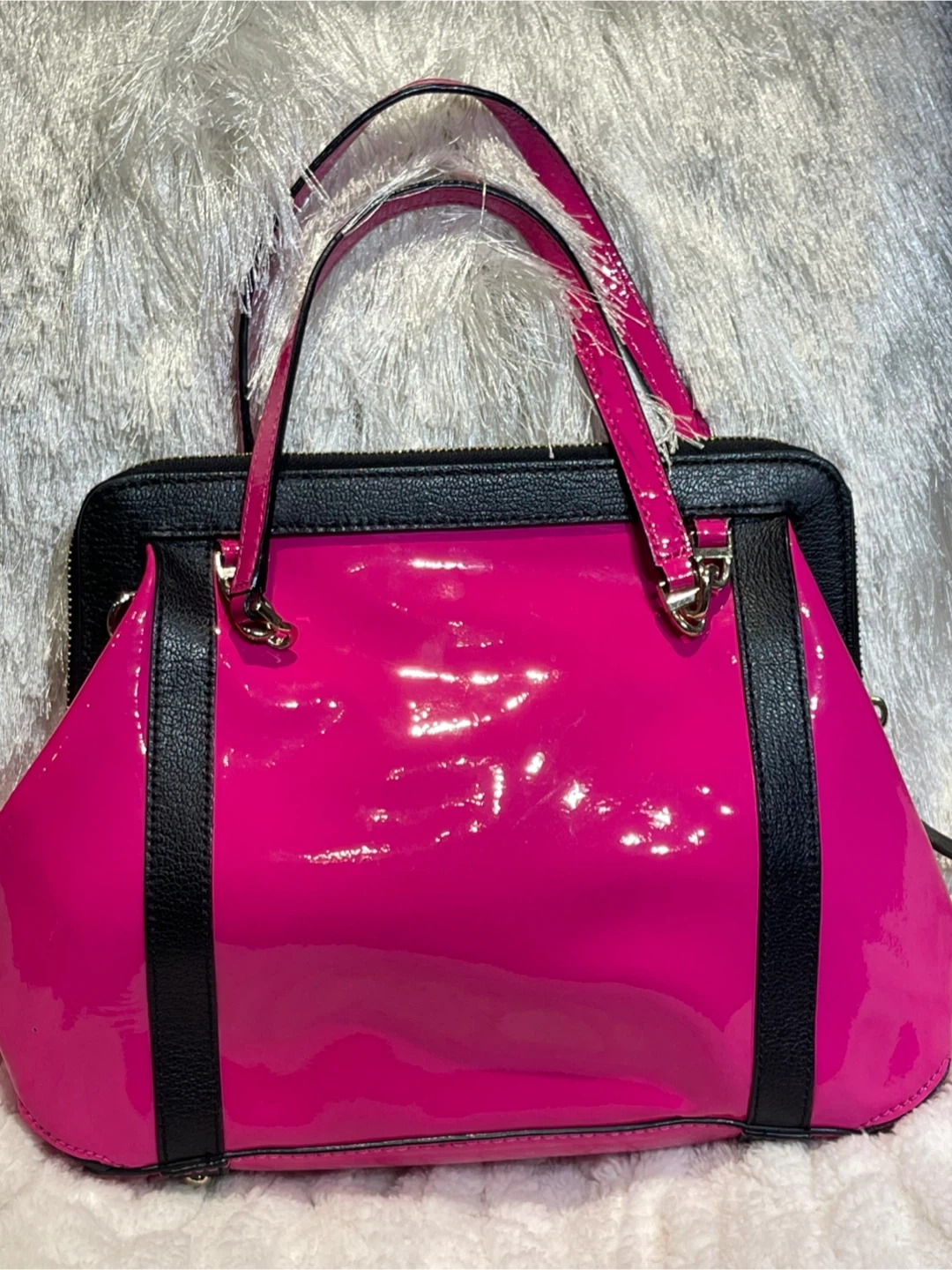 Stunning Authentic Kate Spade bag in vibrant pink patent cowhide leather with black trim – super eye-catching and perfect for spring/summer! This is a statement bag that is guaranteed to get many compliments.