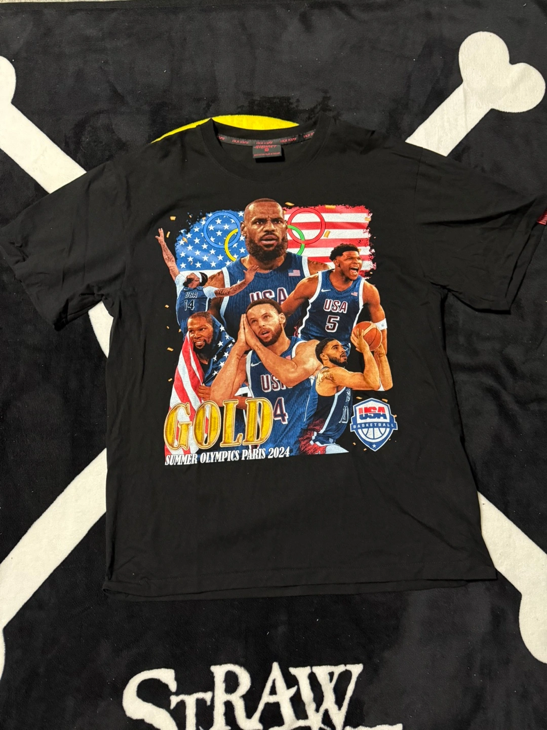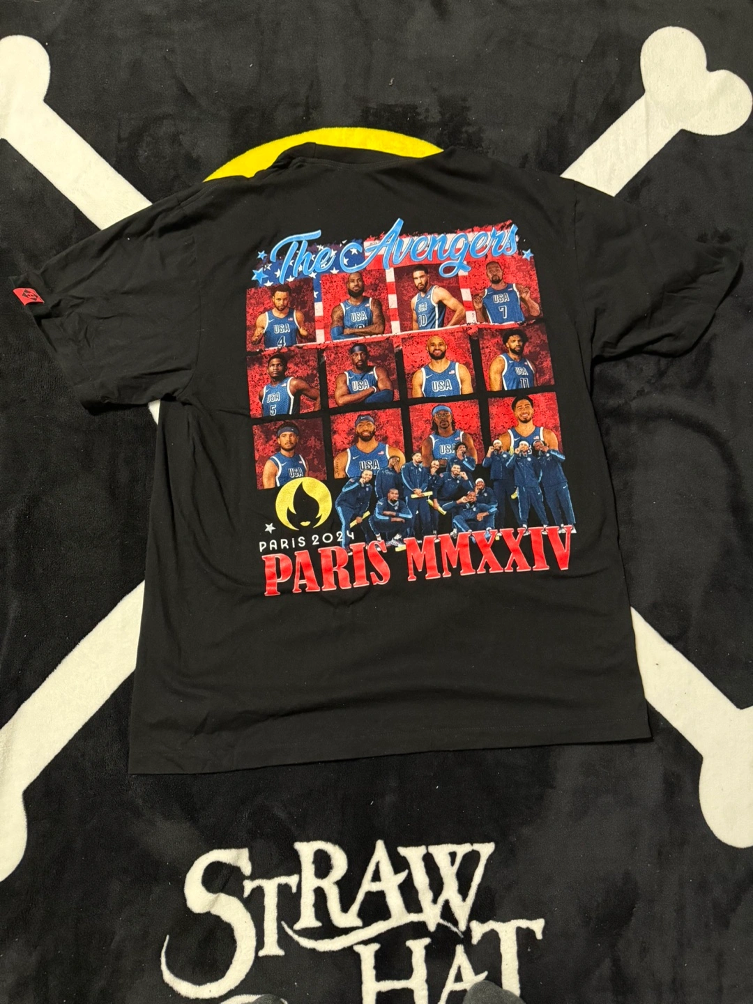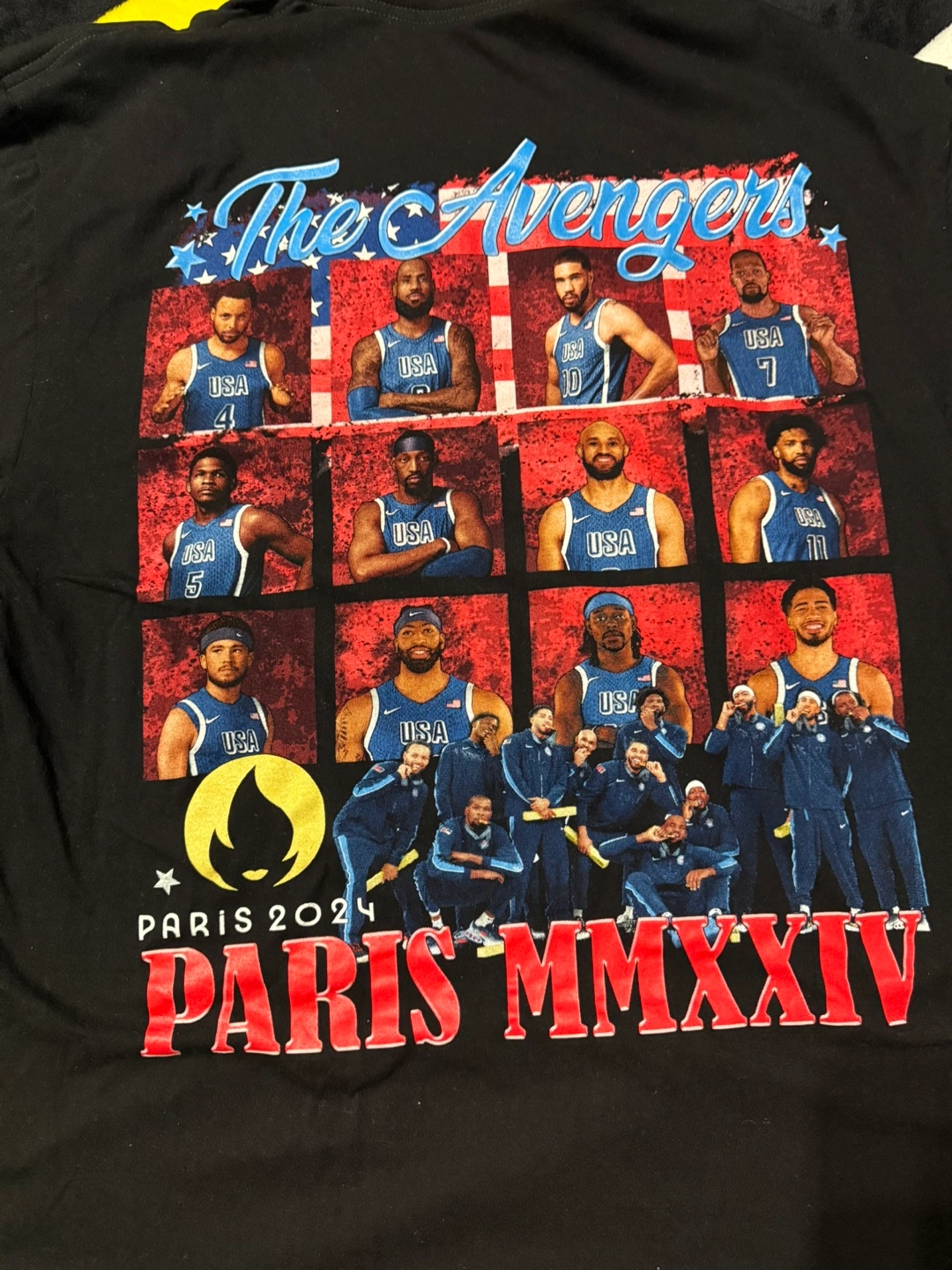 Black T-shirt. Features a graphic of the USA basketball team. In the graphic, the words "The Avengers" are shown above the images of the players. Beneath the images, "Paris 2024" is written. A great tee to relax in on a sunny day. Sizes XL and Large