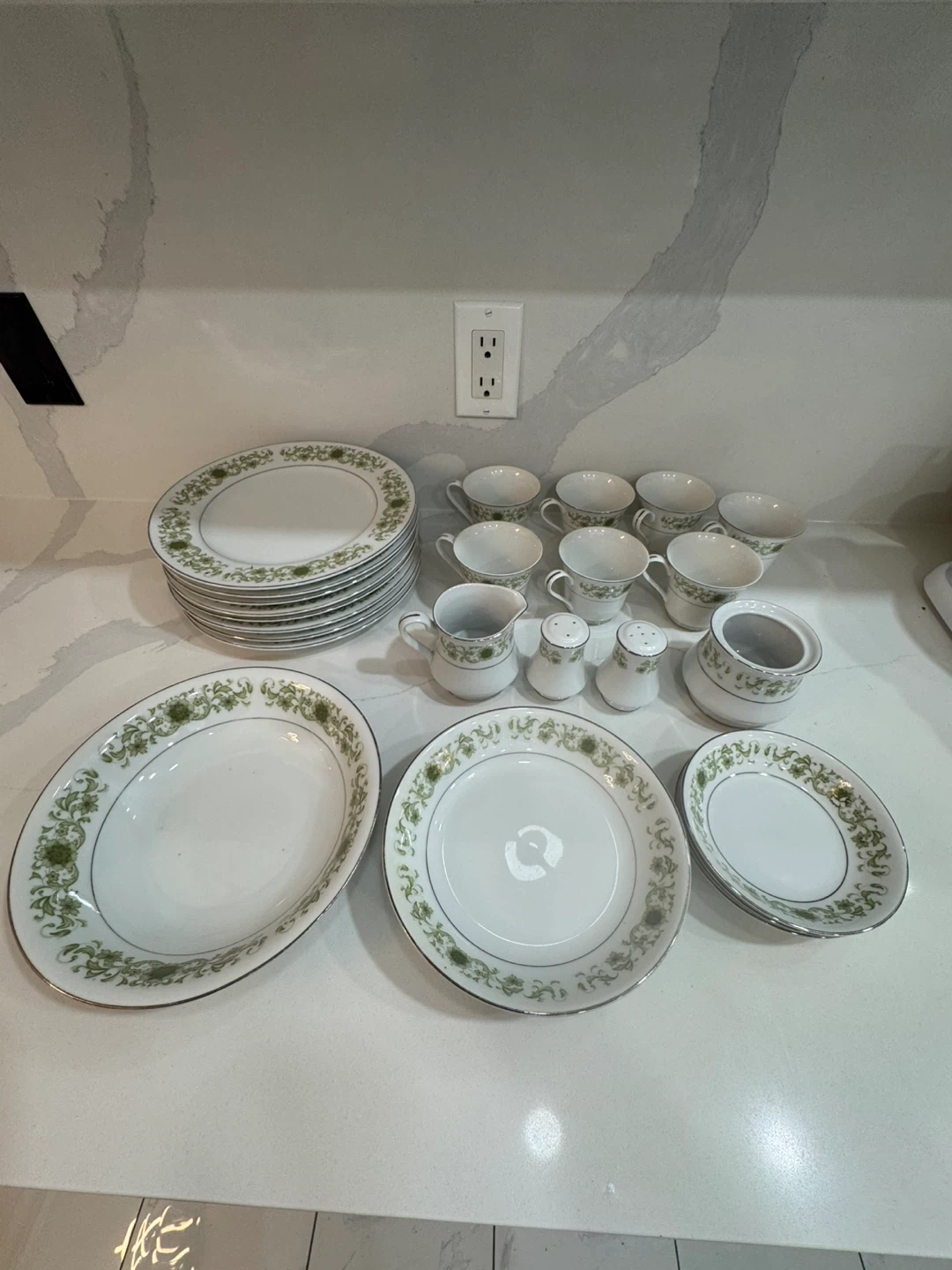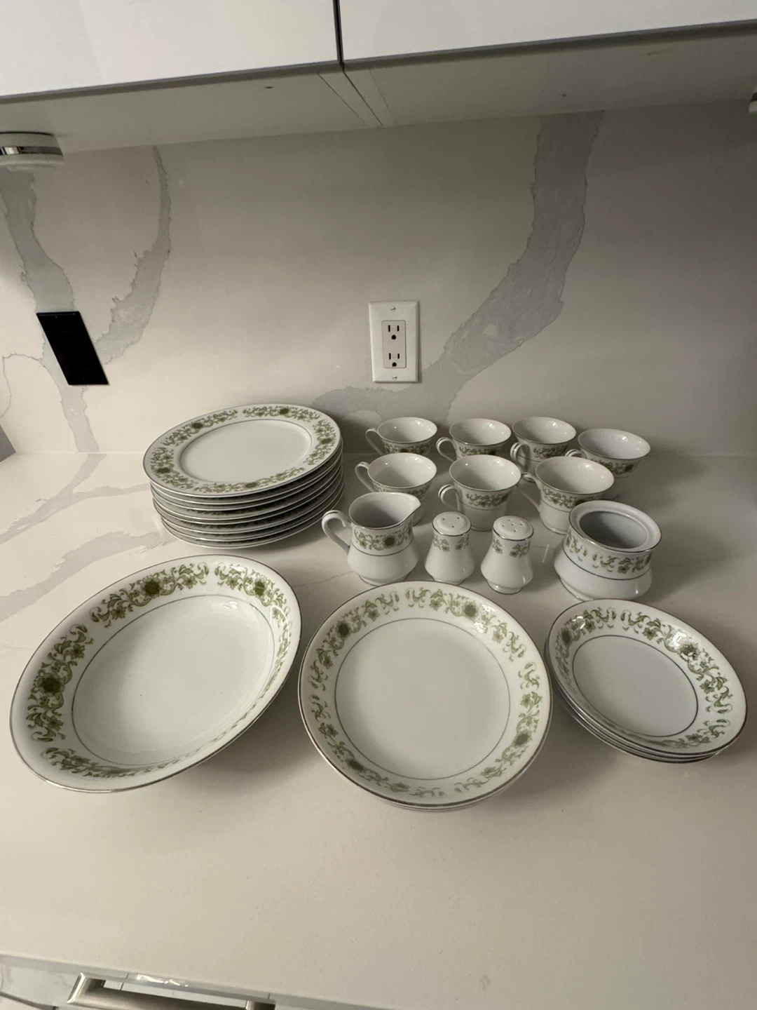 This vintage china set features a delicate green floral pattern on white porcelain. It includes dinner plates, bowls, cups, saucers, a creamer, a sugar bowl, and salt and pepper shakers. It's perfect for hosting special occasions or adding a touch of elegance to everyday meals. Total if 26 pieces, $90 or best offer. Pick up at Steeles & Bathurst area.
