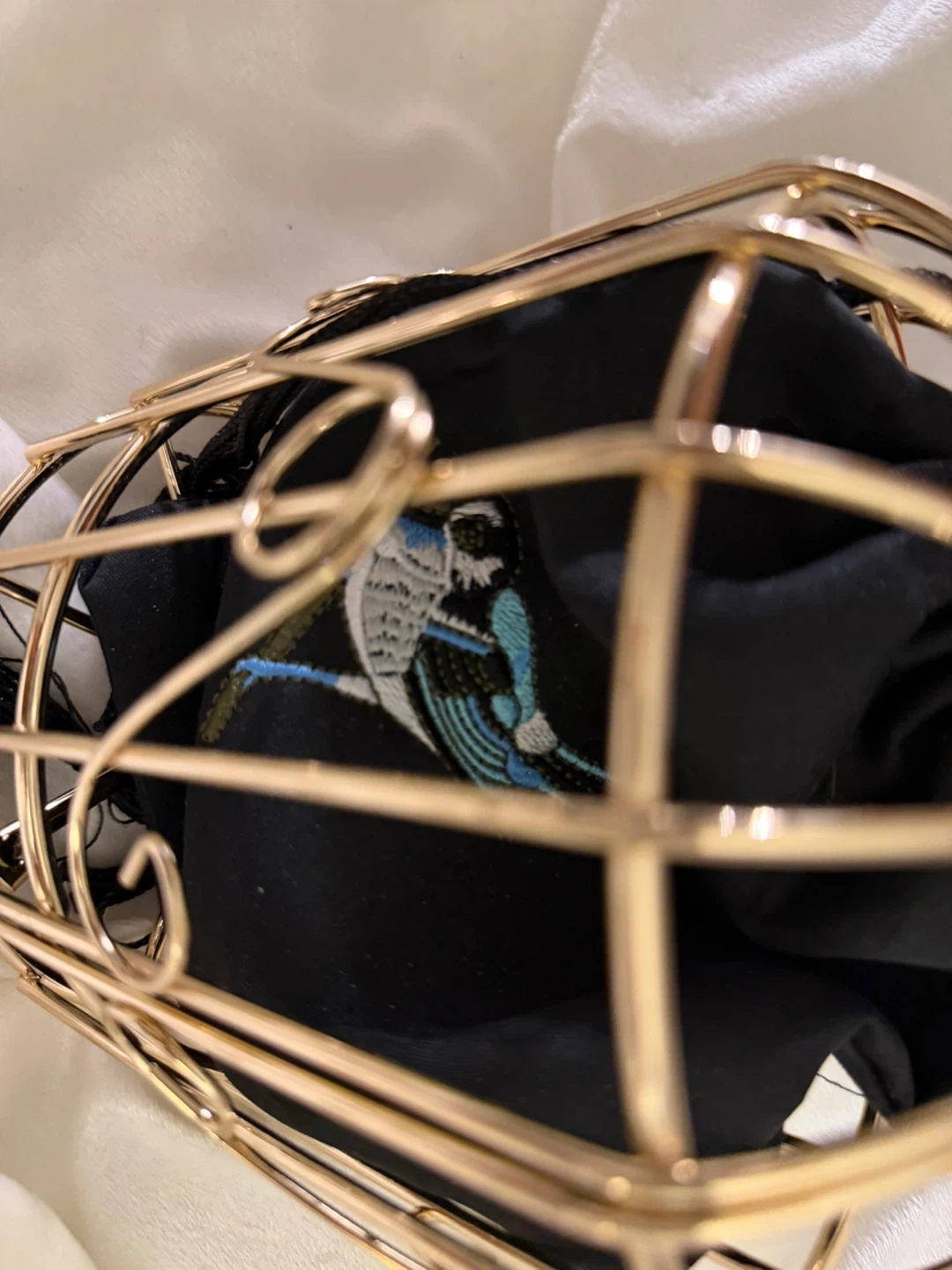 This unique clutch features a striking gold birdcage-style exterior with a drawstring black pouch inside. The pouch is embellished with a delicate blue and white bird embroidery. It's a real conversation starter for any special occasion!