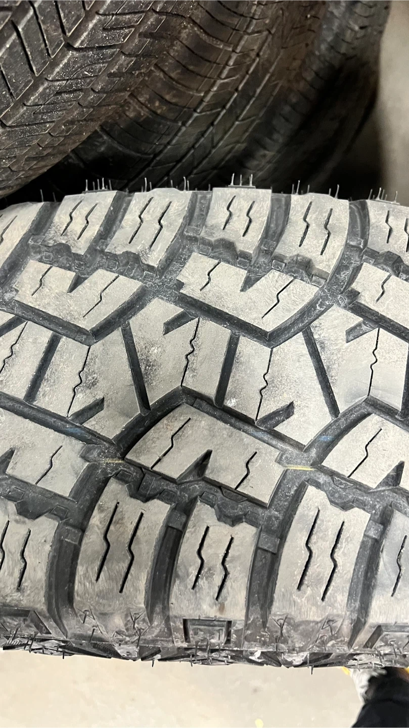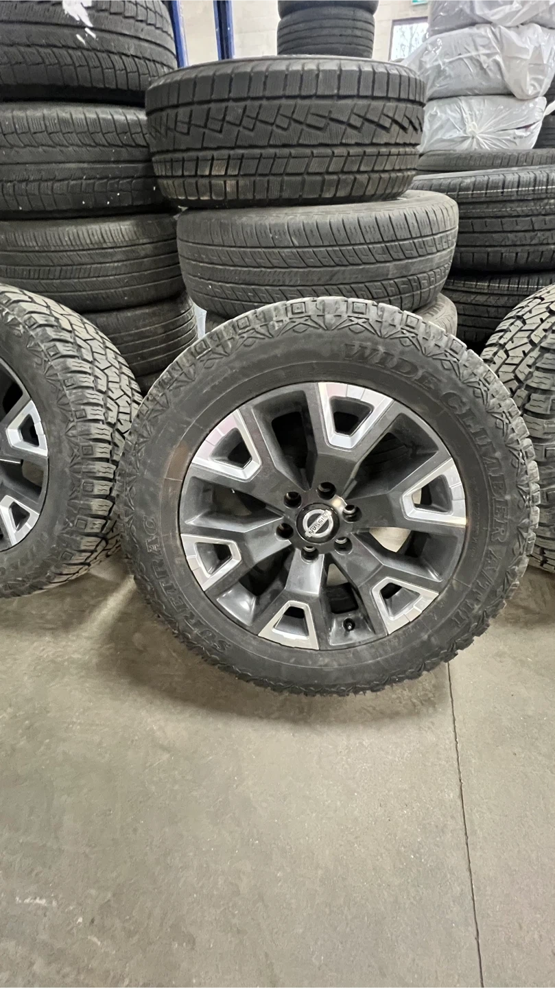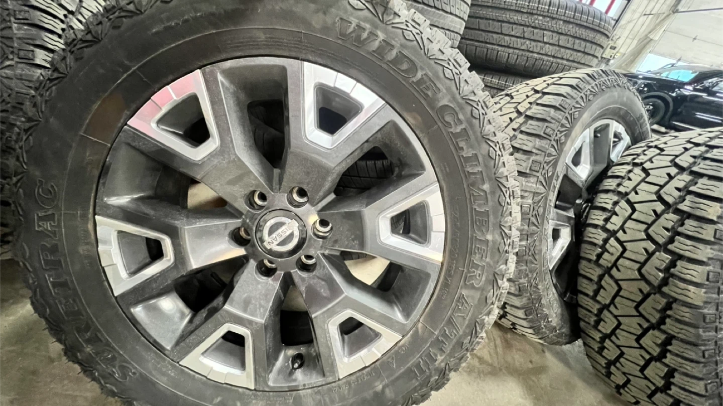 Set of four wide trail all-terrain tires mounted on Nissan rims. Tires are SURTRAC Wide Climber.