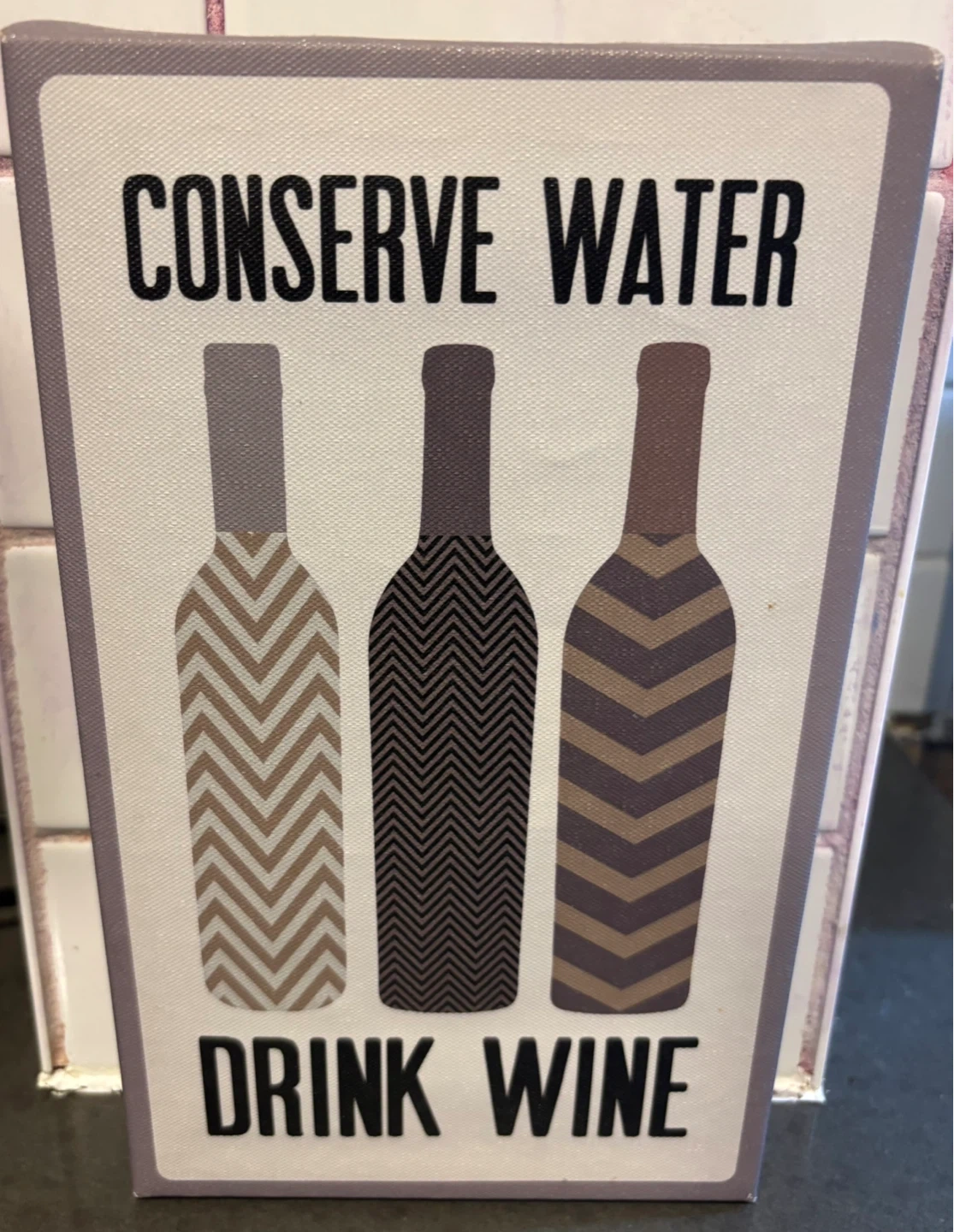 This sign displays 'CONSERVE WATER DRINK WINE' with three decorative wine bottles. It's a fun piece for a kitchen or bar area. The design features chevron patterns on the bottles in brown and beige tones.