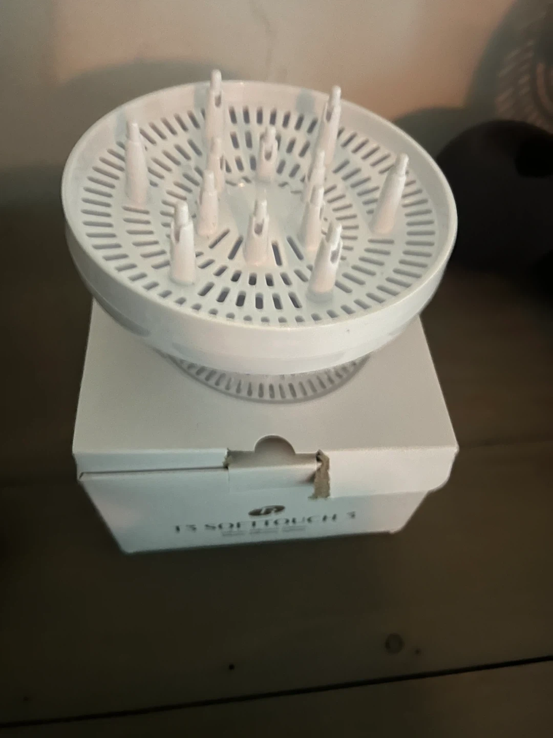 This is the T3 SoftTouch 3 Diffuser, designed for curl defining and hair styling. It helps with anti-frizz for smooth and shiny curls. It's white and includes the original box.