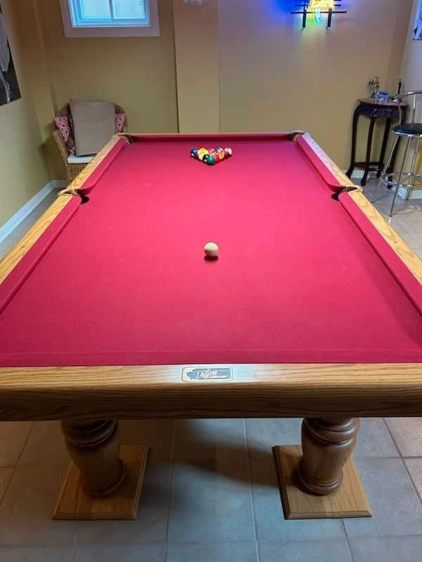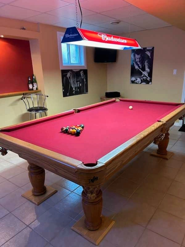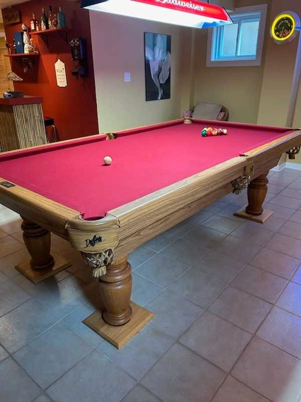 15Selling a used 4x8 Dufferin pool table with a 1" Italian slate. This snooker table is ready for a new home and countless games. It's a great addition to any game room! While this table has seen some action, it's still in good shape for its age and promises plenty of fun. Remember, if the ad is up, the table is available—ready to be the centre of your next game night! In excellent working condition Used 4 x 8 Dufferin slate pool snooker table 1" Italian slate Leather pockets New felt Comes with all accessories , 2 sets of balls (pool and snooker ), cover and Budweiser light Price as is $1800 Table is already dismantled and ready for move