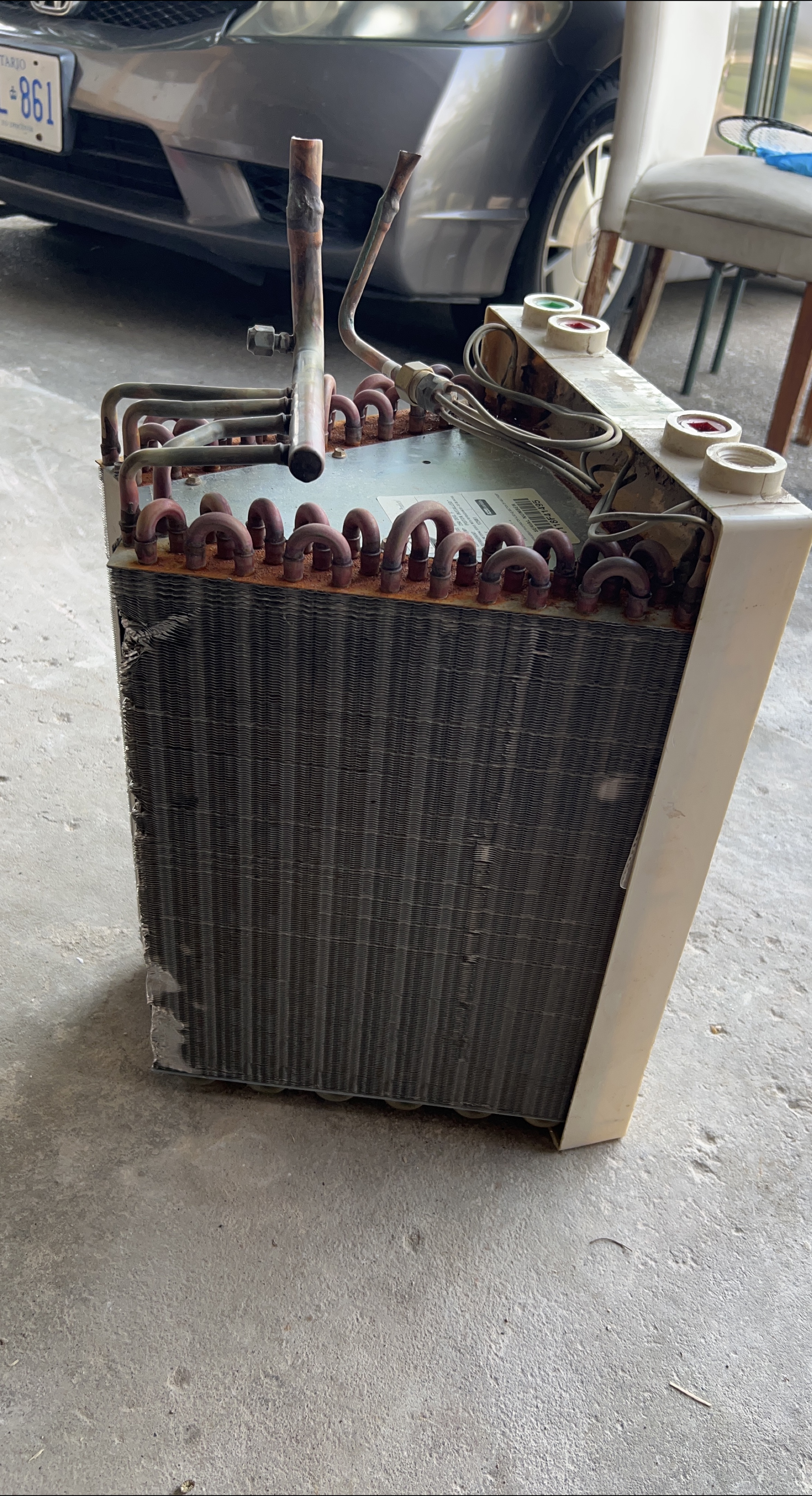 15Selling a used AC evaporator core. It shows signs of wear and tear, including some rust and damage to the fins. Please see the photos for details on the condition.