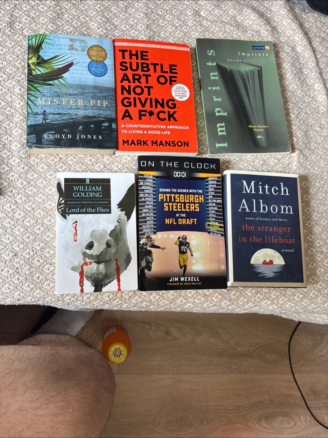 Selling a collection of used books! Titles include: - Mister Pip by Lloyd Jones - The Subtle Art of Not Giving a F*ck by Mark Manson - Imprints Volume 1 - Lord of the Flies by William Golding - On the Clock: Behind the Scenes with the Pittsburgh Steelers at the NFL Draft by Jim Wexell - The Stranger in the Lifeboat by Mitch Albom