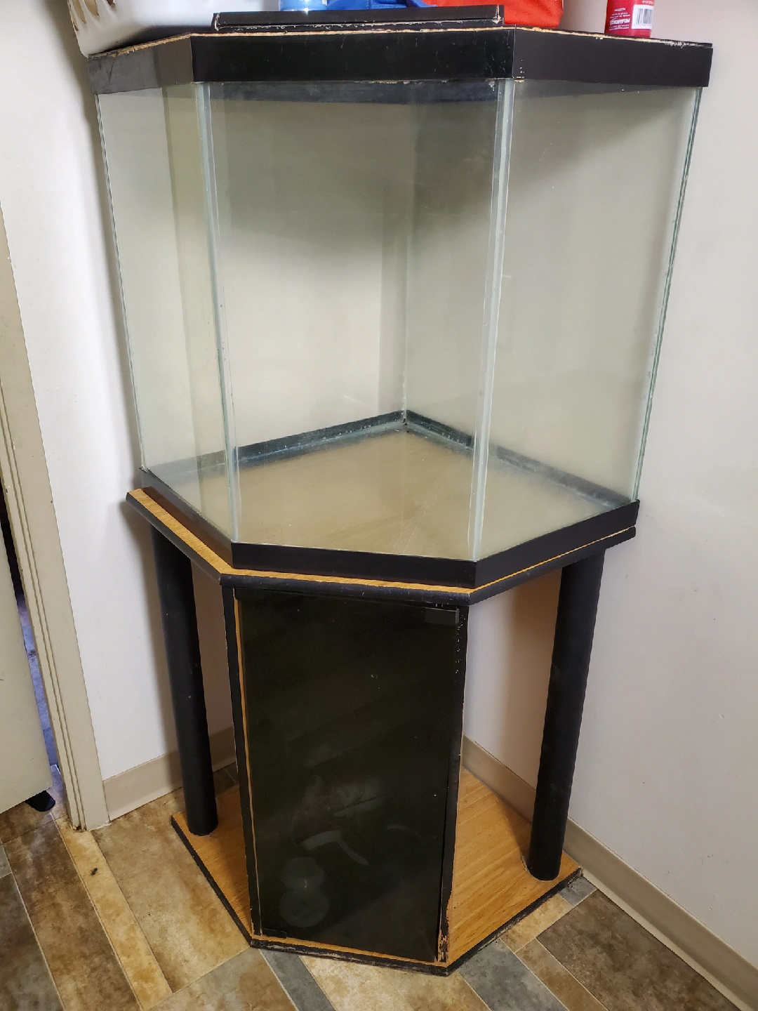 Selling a used hexagon fish tank with a stand. It's a unique shape that could be a great addition to your home. The stand is included, making it easy to set up. There are some signs of wear and tear on the stand, but the tank itself is in good condition I believe it's a 50 gallon or more