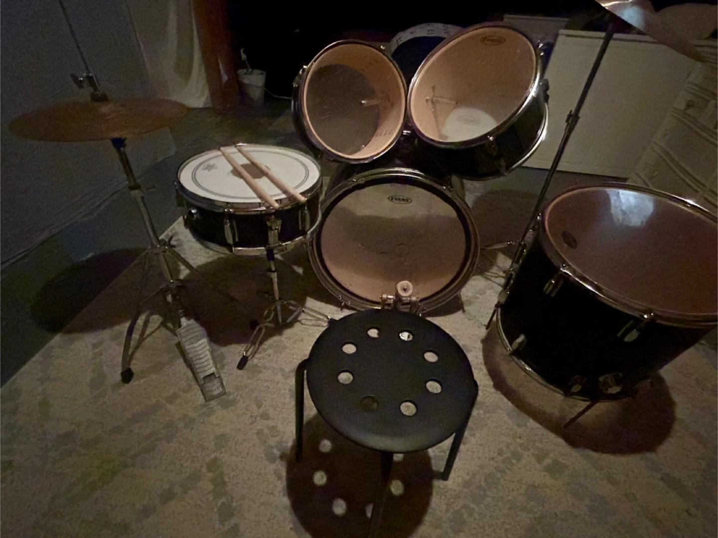 Selling a used Evans drum set that's ready to make some noise! It includes several drums, a cymbal, a pedal, and a stool. Perfect for someone looking to start playing or upgrade their current kit. All pieces are in used condition.