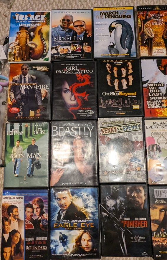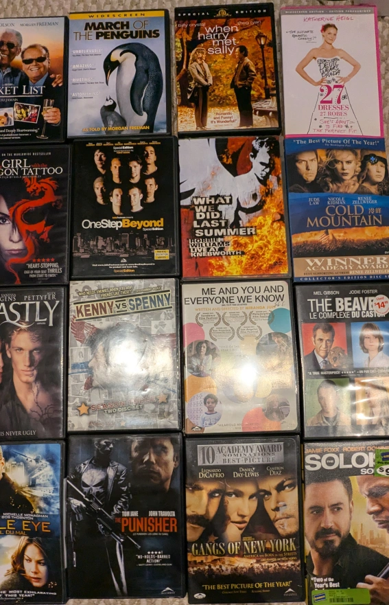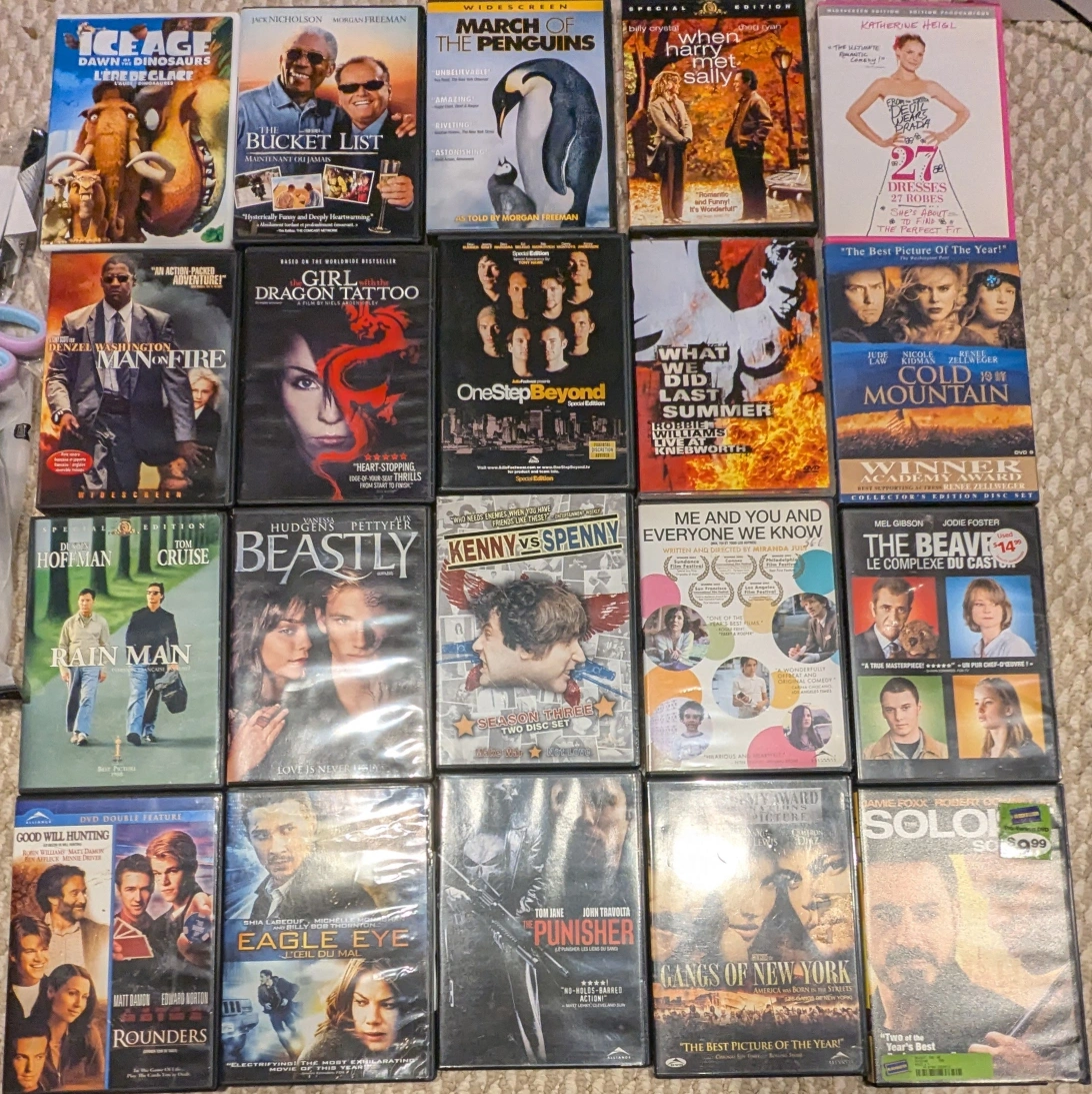 Available individually, starting at $2-10 ...better pricing for bulk sales of 5+ qty: πΏ π₯ β’ Ice Age: Dawn of the Dinosaurs β $5 β’ The Bucket List (Jack Nicholson, Morgan Freeman) β $2 β’ March of the Penguins (Morgan Freeman narration) β $5 β’ When Harry Met Sally (Special Edition) β $3 β’ 27 Dresses (Katherine Heigl) β $2 β’ Man on Fire (Denzel Washington) β $3 β’ The Girl with the Dragon Tattoo (original Swedish version) β $5 β’ One Step Beyond (Tony Hawk, Bam Margera) Special Edition) β $10 β’ What We Did Last Summer β Robbie Williams at Knebworth β $10 β’ Cold Mountain (Academy Award Winner Edition) β $5 β’ Rain Man (Special Edition, Dustin Hoffman & Tom Cruise) β $5 β’ Beastly (Vanessa Hudgens, Alex Pettyfer) β $2 β’ Kenny vs. Spenny β Season Three (2-disc set) β $10 β’ Me and You and Everyone We Know (Miranda July) β $10 β’ The Beaver (Mel Gibson, Jodie Foster) β $3 β’ Good Will Hunting / Rounders (Double Feature) β $10 β’ Eagle Eye (Shia LaBeouf) β $2 β’ The Punisher (Marvel, Tom Jane, John Travolta) β $3 β’ Gangs of New York (Leonardo DiCaprio, Daniel Day-Lewis, Cameron Diaz) β $5 β’ Soloist (Jamie Foxx, Robert Downey Jr.) β $2