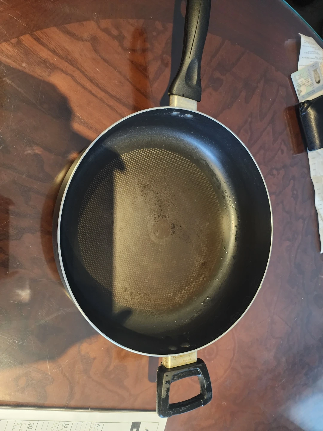 65Selling a used frying pan. It has a black non-stick surface and a black handle. There are some signs of use on the pan.