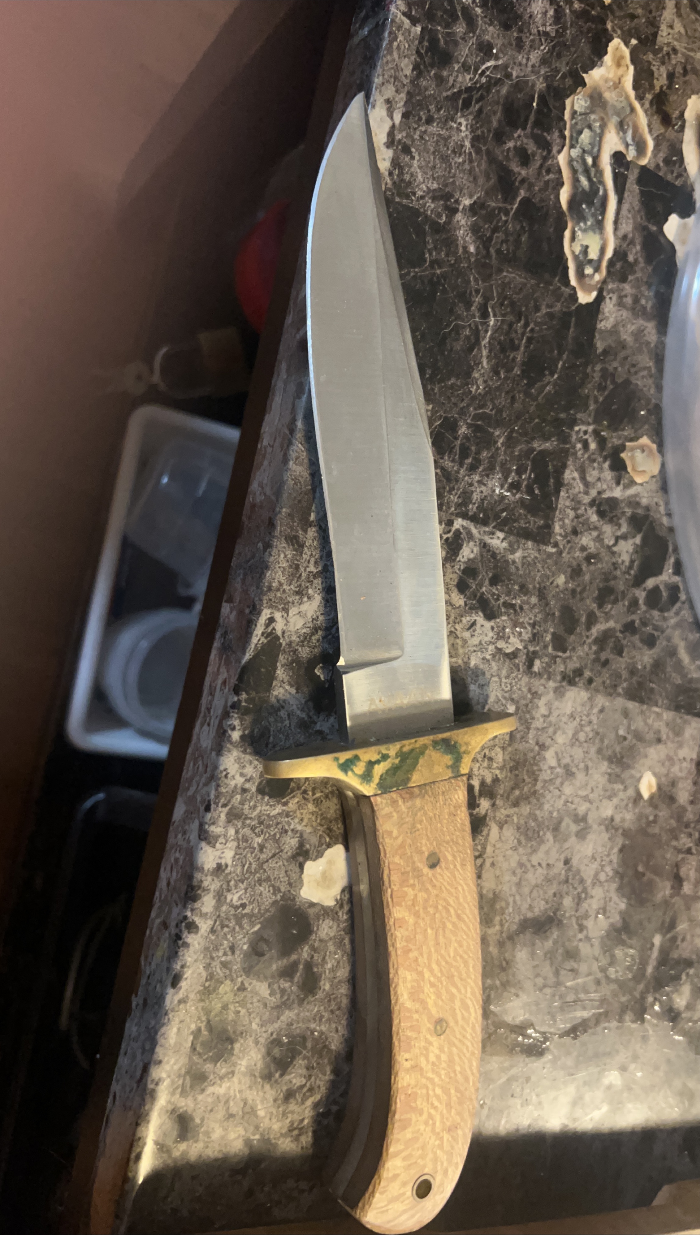 Selling a used hunting knife. It has a wooden handle and a sturdy blade. Good for outdoor activities or collecting